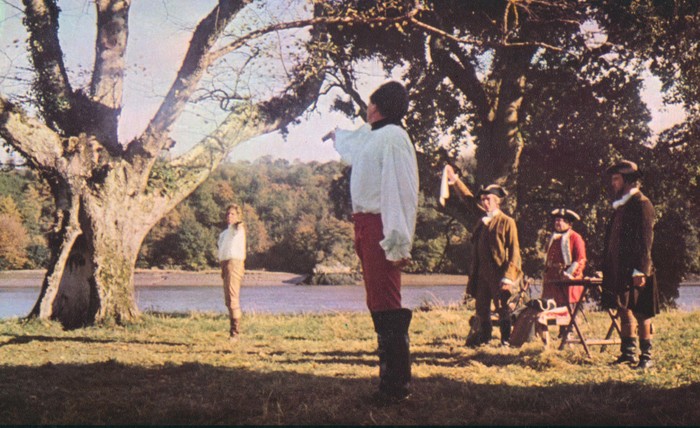 Дальше я заспойлерю весь фильм, так что советую читать после просмотра. Уже с первого кадра мы знакомимся с этим приёмом Кубрика- красивый английский пейзаж и маленькие фигуры персонажей разыгрывающих дуэль, на которой убивают отца Барри. Всё это сопровождается отстранённым закадровым голосом рассказчика. Кстати, у Тиккирея повествование от лица самого Барри. Кубрик же нам просто рассказывает историю, учитывая что это ещё и фильм то происходит такое двойное отстранение.