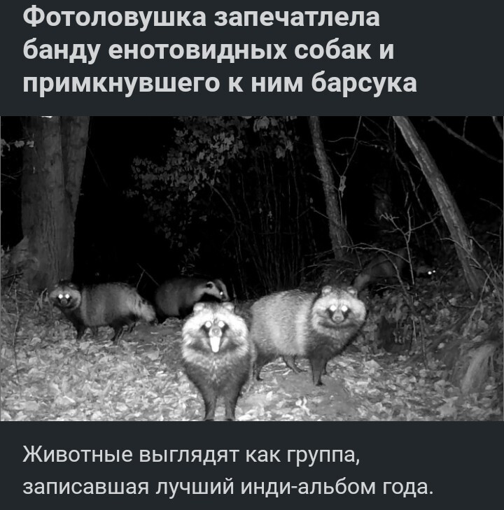 10 n1cn2m3r Баяны Барсук или басист или барабанщик... 2 года назад Фотоловушка запечатлела банду енотовидных собак и примкнувшего к ним барсука Комментарии на Пикабу Дикие животные Неожиданная концовка Скриншот 1 Ещё 0