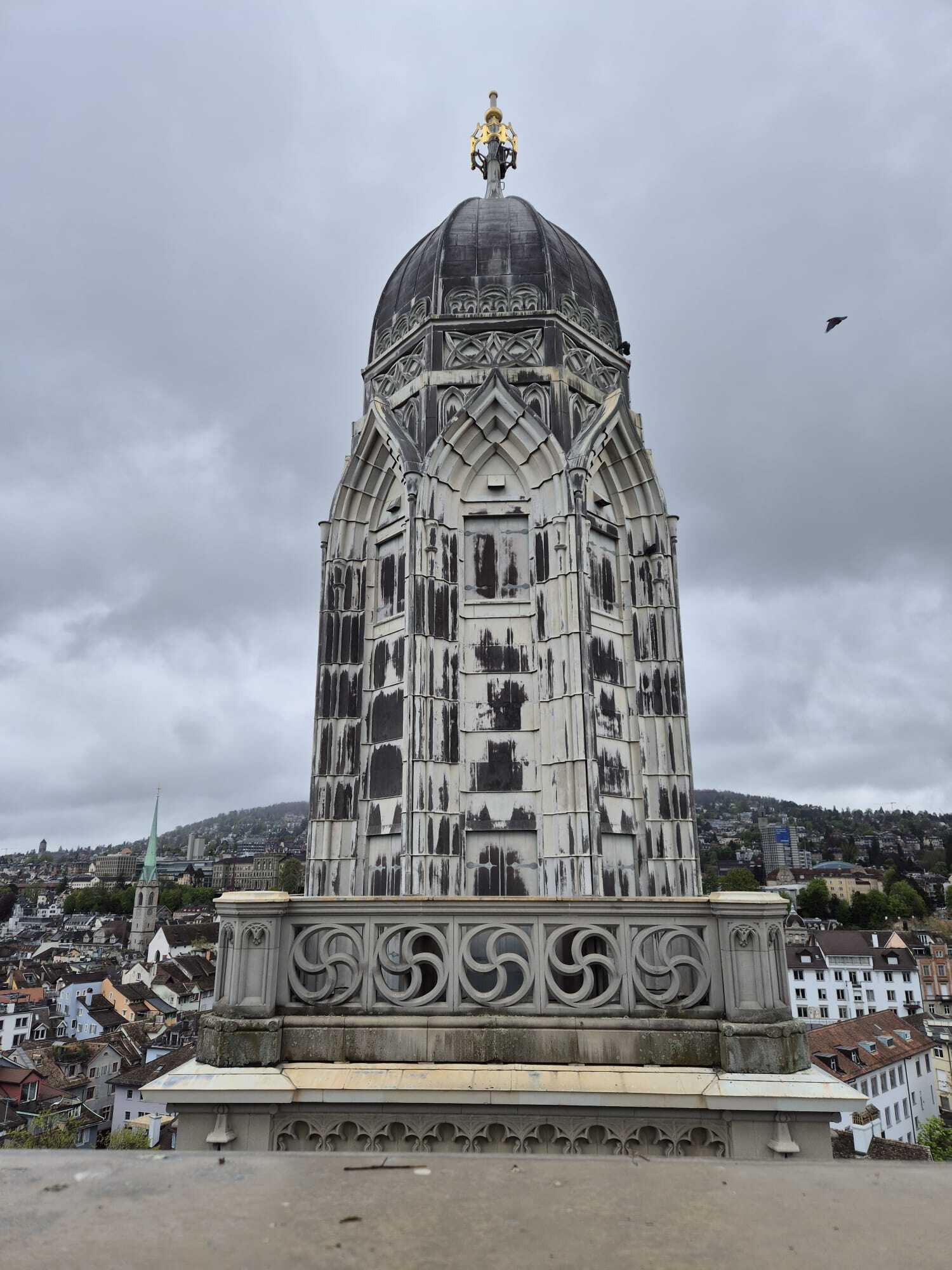 - Особенно выделяется **готическая башня** с часами и фигурками.