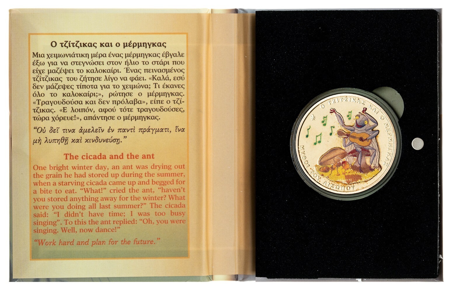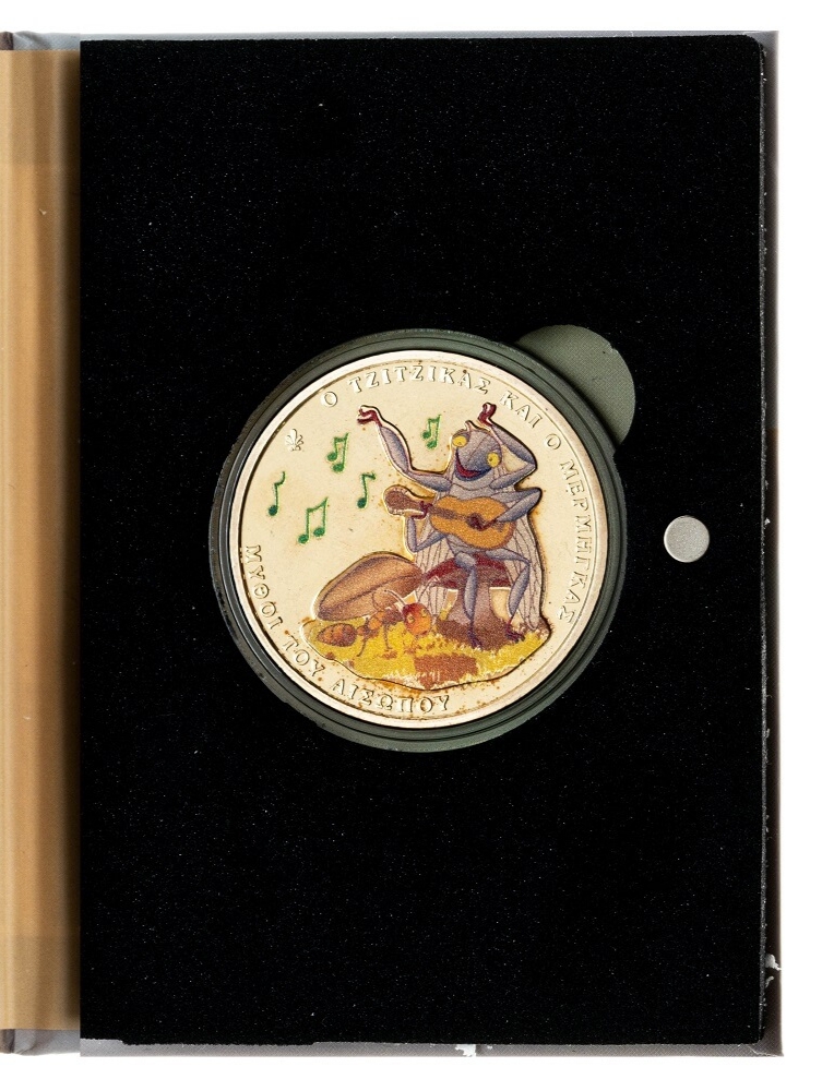 Данная монета поставляется в буклете, чтобы он случайно не открылся имеются магниты, на одной внутренней стороне написа басня Эзоп на греческом,а для тех кто не знает языка Эзопа перевод на английском.