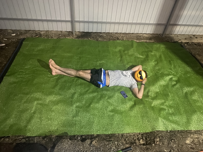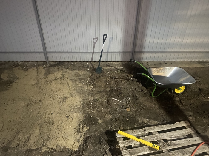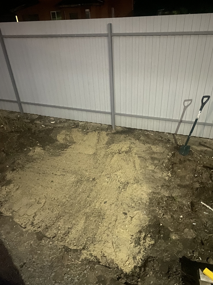 Участок с небольшим уклоном, решил занизить край, который ближе к дому, поэтому пришлось немного поработать лопатой, а именно перекопать участок 2,5х2,5 метра в половину штыка и распланировать лишнюю землю по участку. Разравнивать все граблями и убрав все крупные камни и останки стройматериалов, присыпал плацдарм песком.