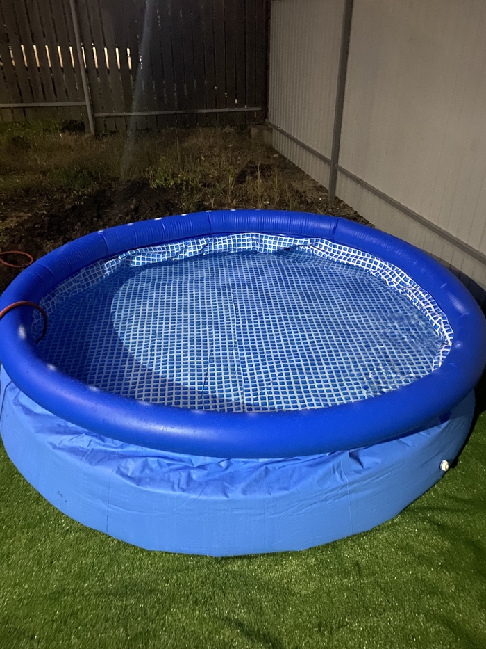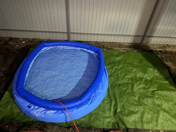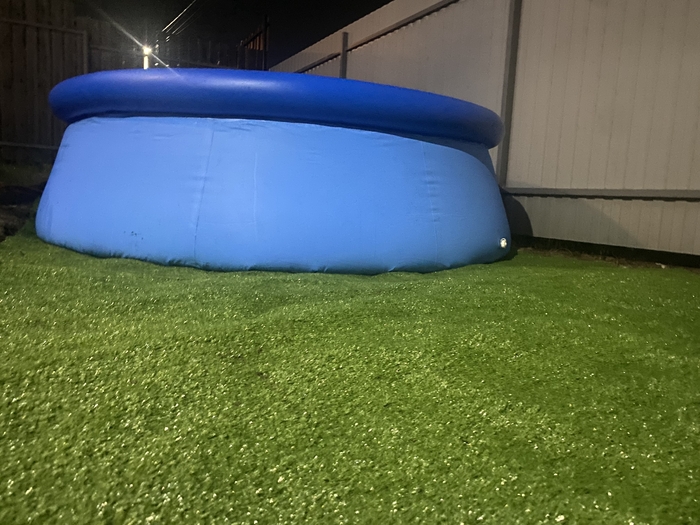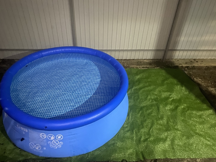 Купив за 3000 рублей бассейн размером 2,4х2,4х0,76 (максимальная высота воды — 58 см, то что нужно для 4х летнего ребёнка, да и взрослый может искупаться) и все необходимое для установки, а именно рулон самой дешевой искусственной травы(пусть меня закидают палками эксперты, но просто на землю или на песок, по моему скромному мнению, ставить опасно) размером 2,5х4(решил оставить немного места, чтобы разуваться/вытираться)