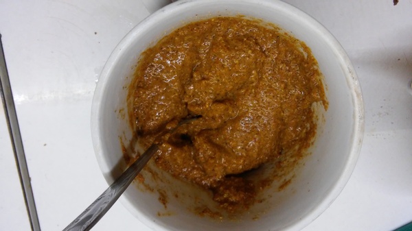 Для обмазки на рынке у восточных людей была куплена готовая смесь, в которую входит пажитник (чаман, обязательный компонент обмазки, по идее, можно купить в аптеке), и другие пряности (черный и красный перец, возможно, куркума, некоторые используют молотый чеснок, орегано, хмели сунели и пр, выбор зависит от ваших предпочтений). На 1 кг мяса у меня ушло примерно 50 грамм сухой смеси. Смесь лучше купить с запасом, чтобы потом не пришлось думать, где ее брать, если не хватило обмазать 2 см.
