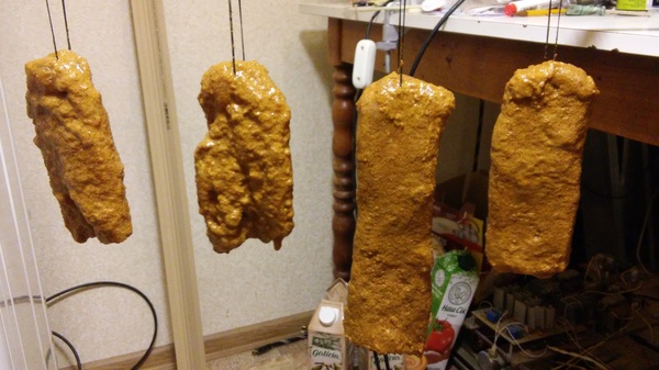 Поэтому советы вялить мясо в комнате, на кухне, на сквозняке, с обдувом вентилятором или, не дай бог, в электросушилке абсолютно неверные. Готовить бастурму надо в помещении с жестким температурным режимом и влажностью, без сквозняков и прямых солнечных лучей. У меня это получилось сделать на балконе, благо, в мае весна была дождливая, безветренная и холодная.