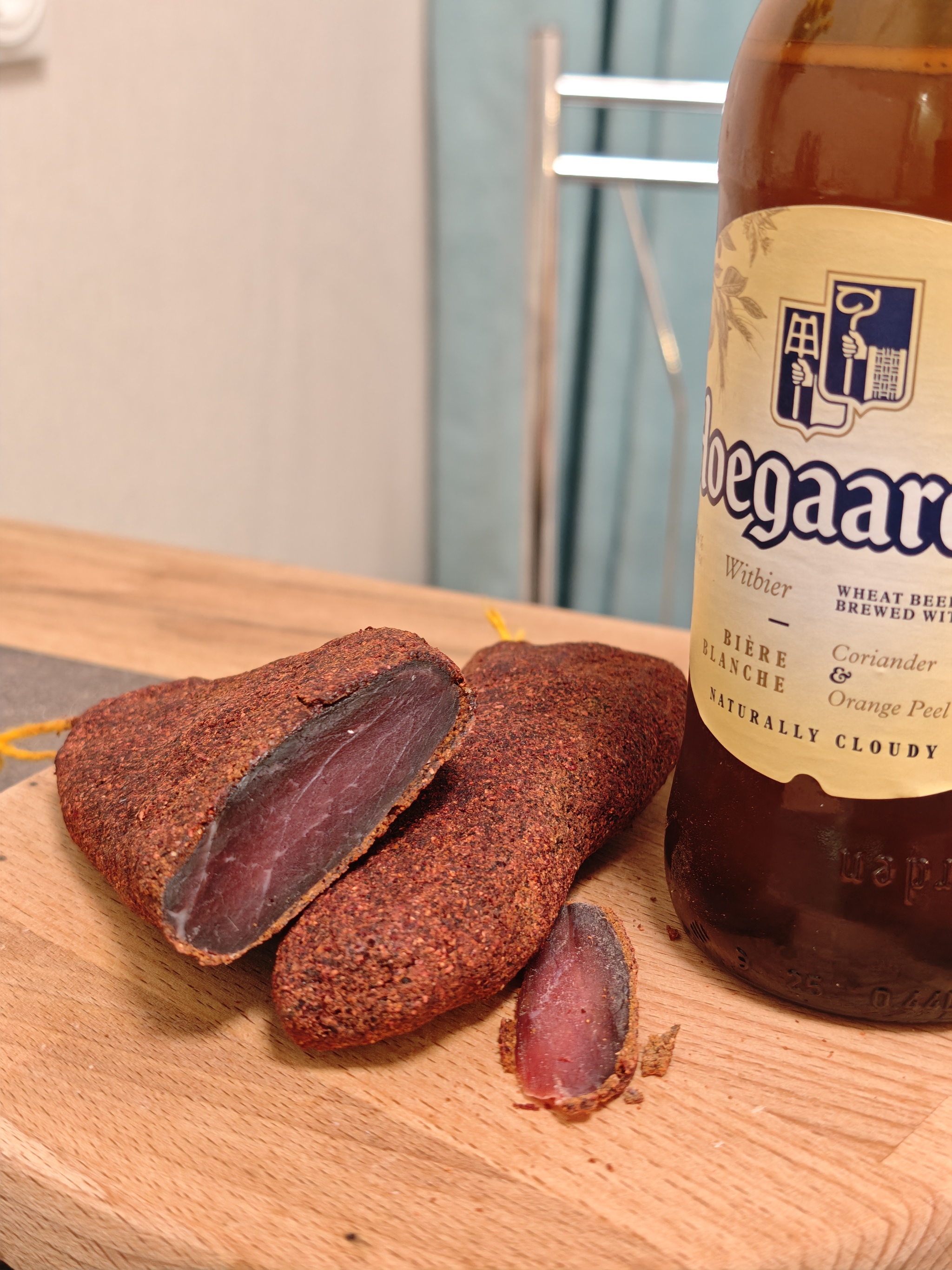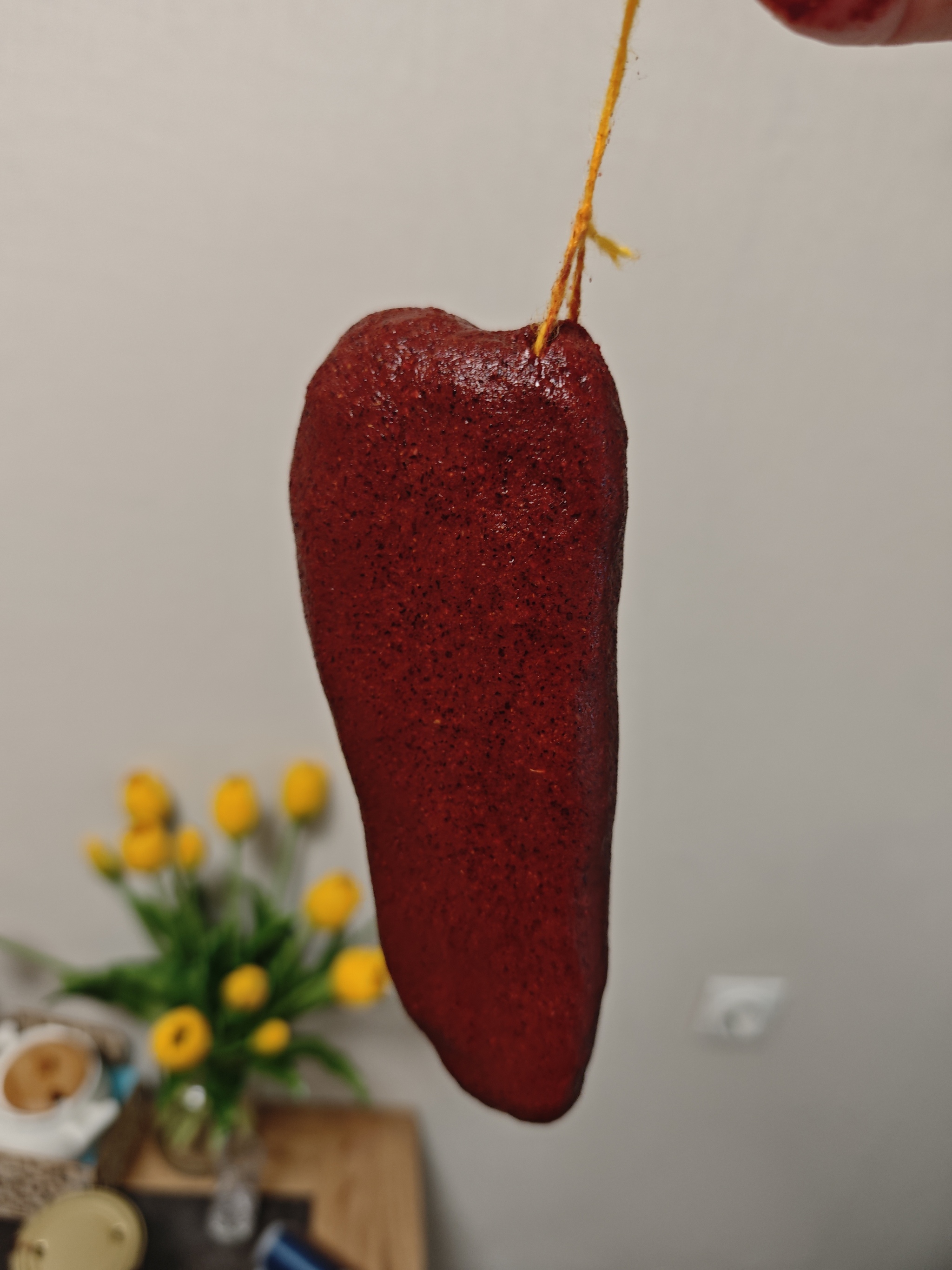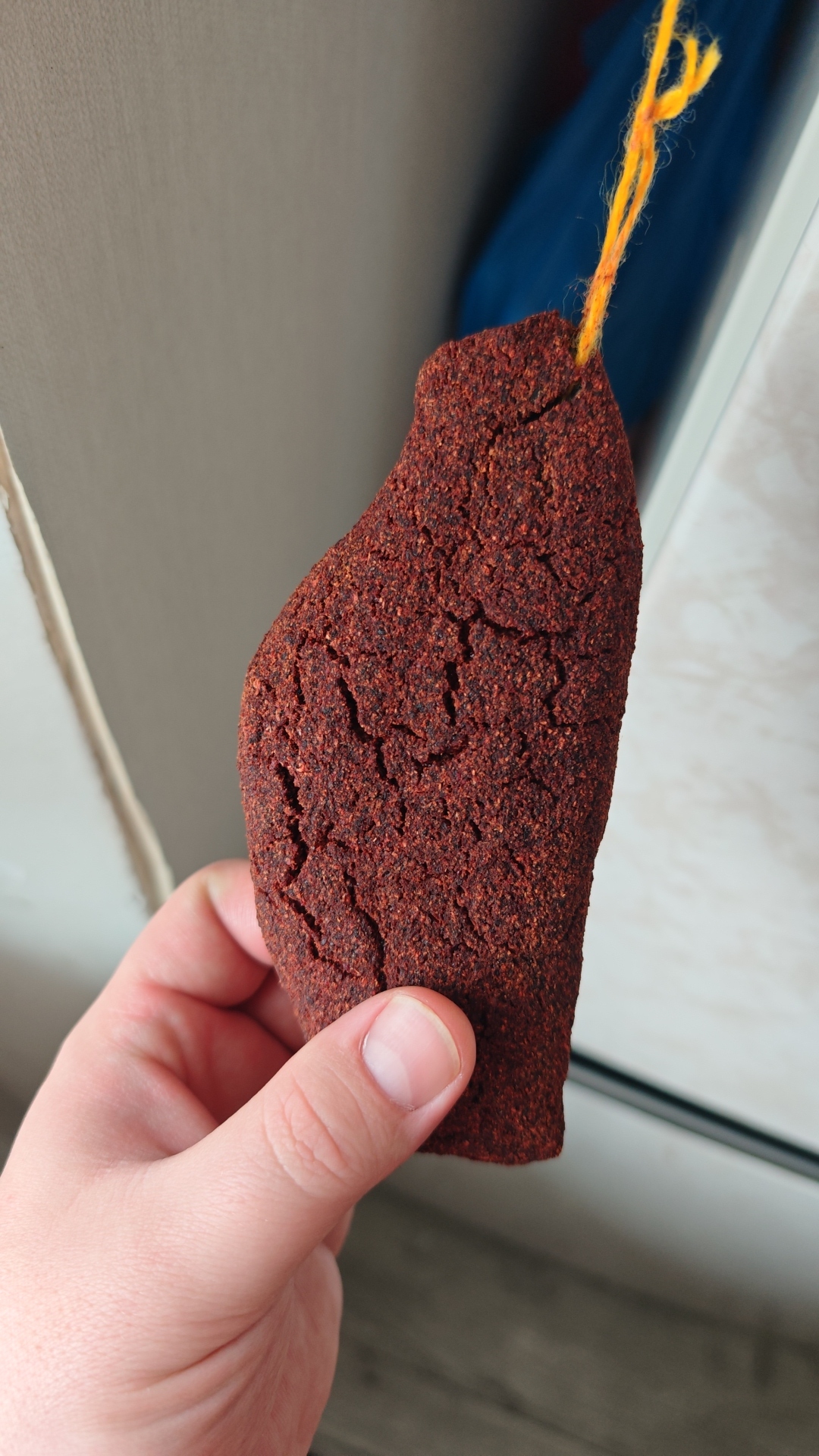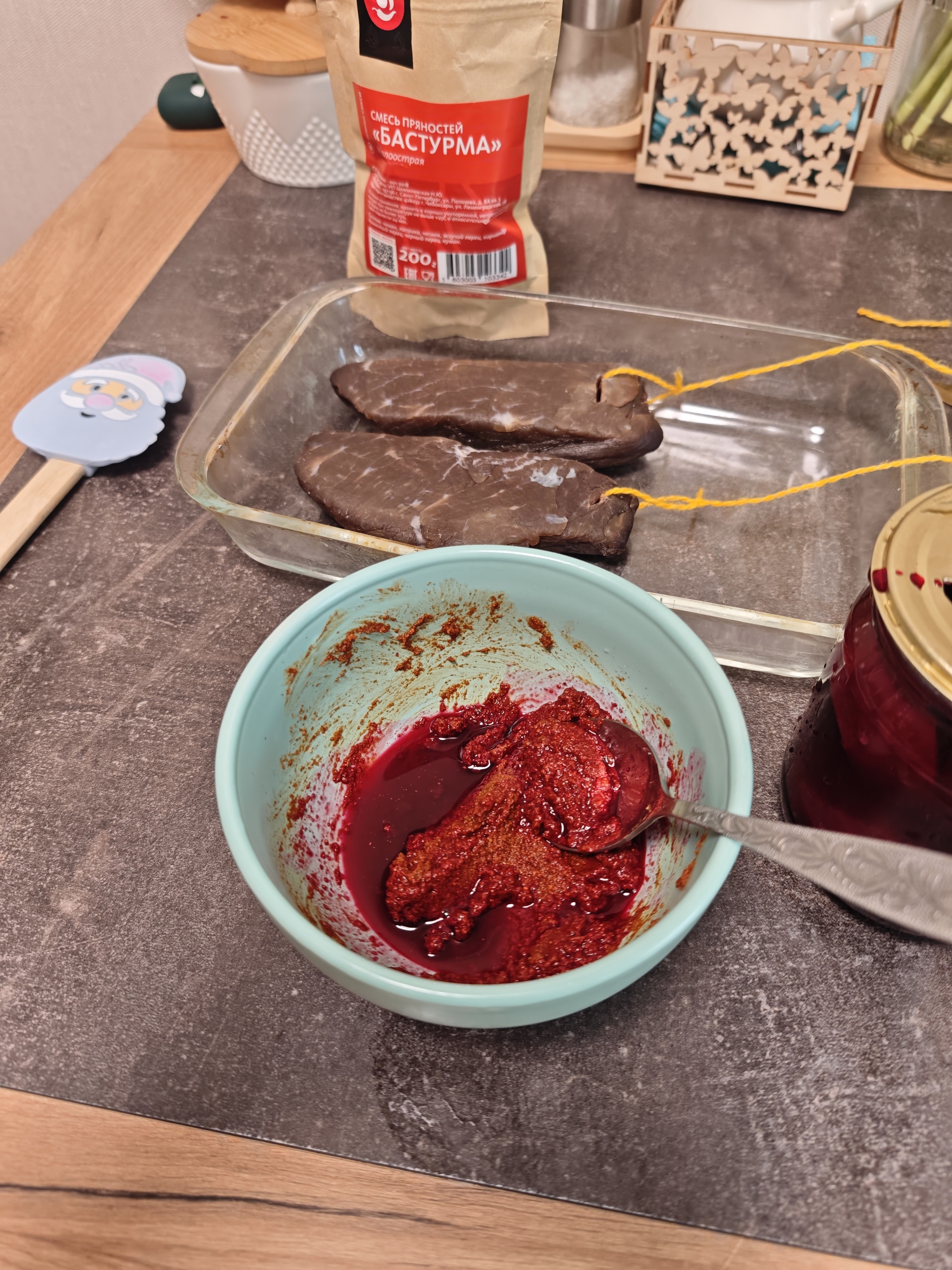 Сперва хотел заморочиться и сделать приправу сам, но понял что чаман я у себя в городе не найду, придется заказывать и поэтому решил заказать уже готовую приправу для бастурмы. К приправе добавил воду, сок свеклы для цвета, добился консистенции густой сметаны и обмазал куски мясо. Повесил сушиться.
