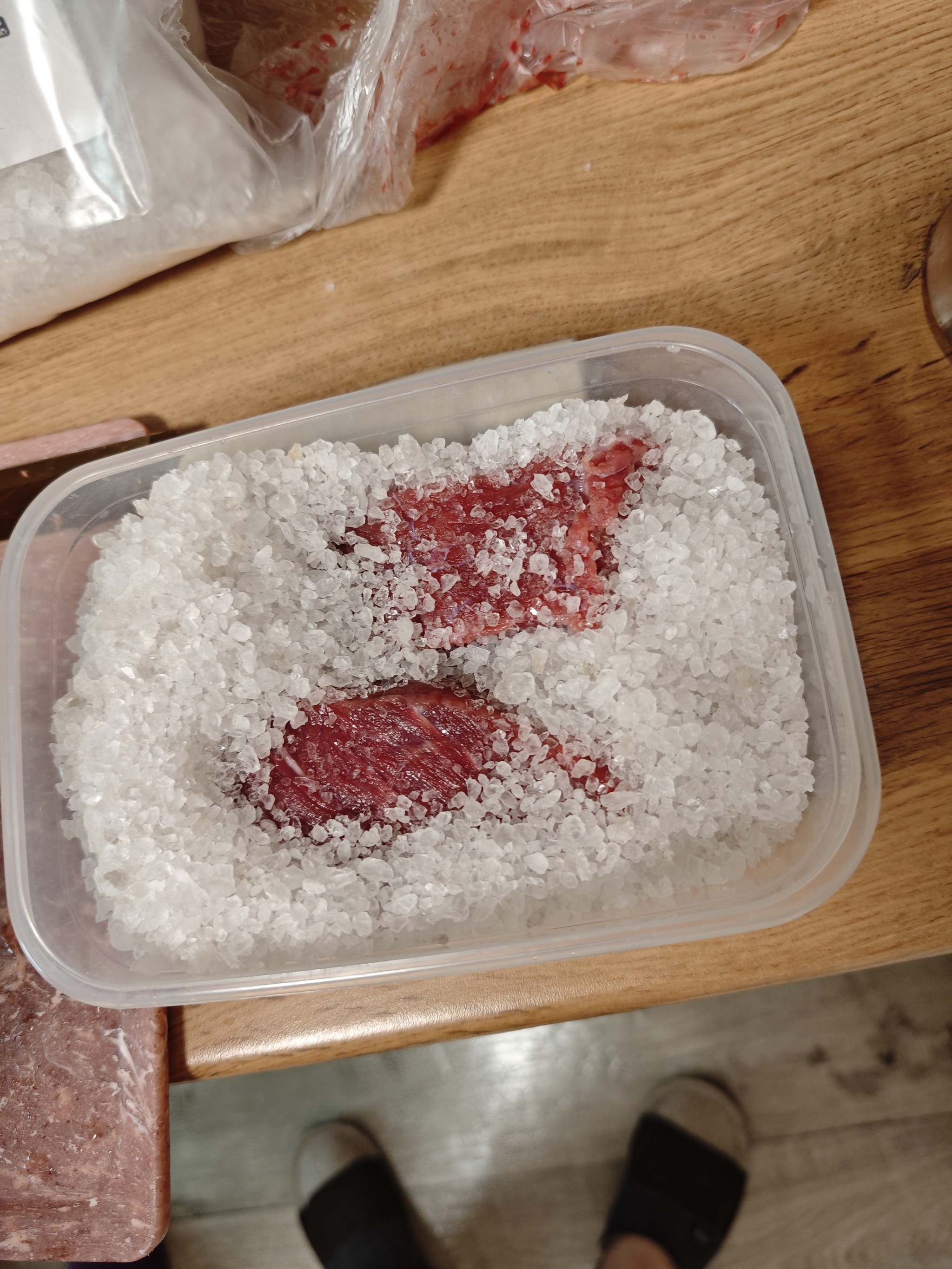 Засыпал полностью 2 куска мясо солью, предварительно насыпав в тару, да бы мясо контактировало солью со всех сторон и на три дня в холодильник, каждый день сливал накопившуюся воду. После промыл холодной водой и держал в воде 3 часа, меня воду каждый час. Обсушил мясо бумажной салфеткой.