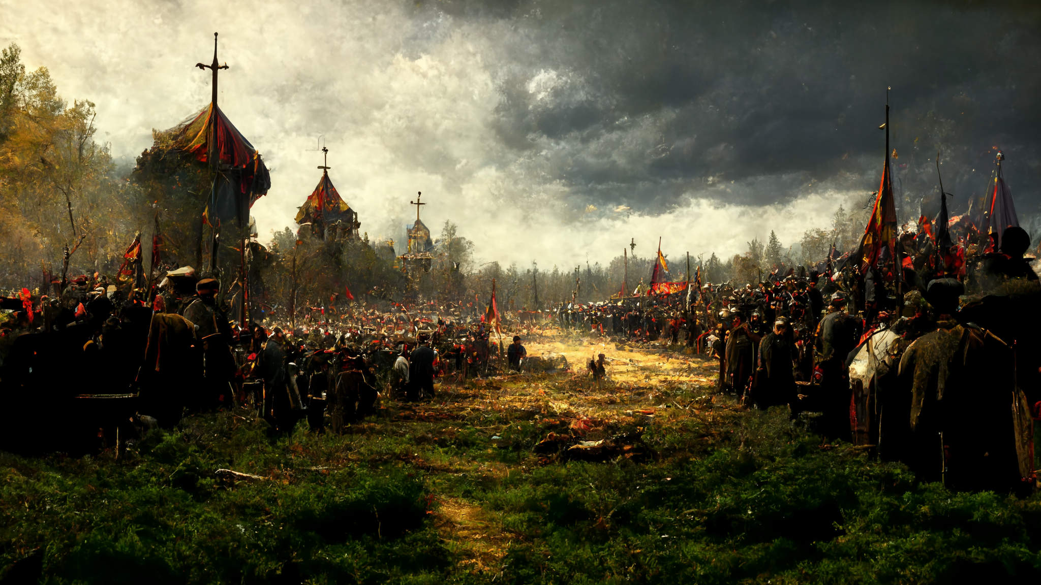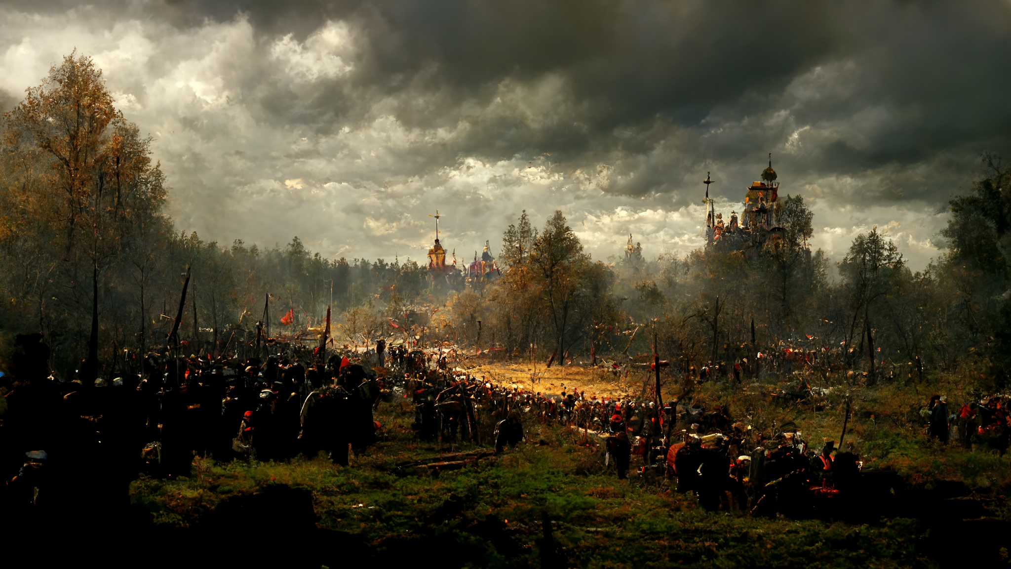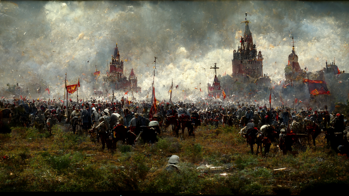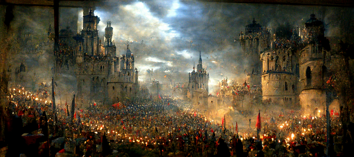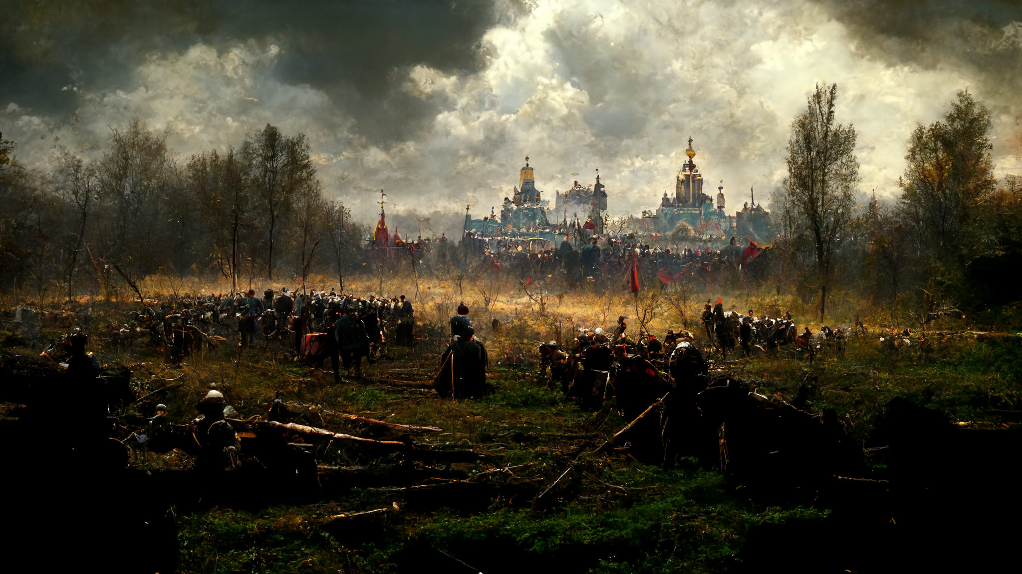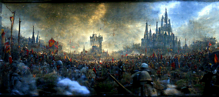 Экспериментировал с Midjourney, комбинируя имена различных художников с ключевыми словами "medieval 2 total war hyperrealism high detail --ar 16:9".