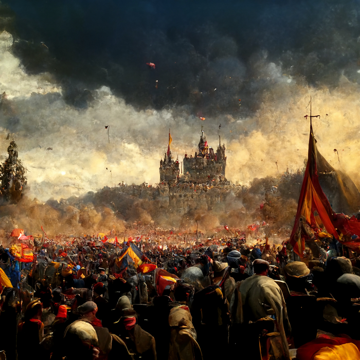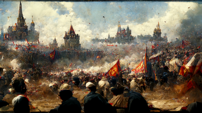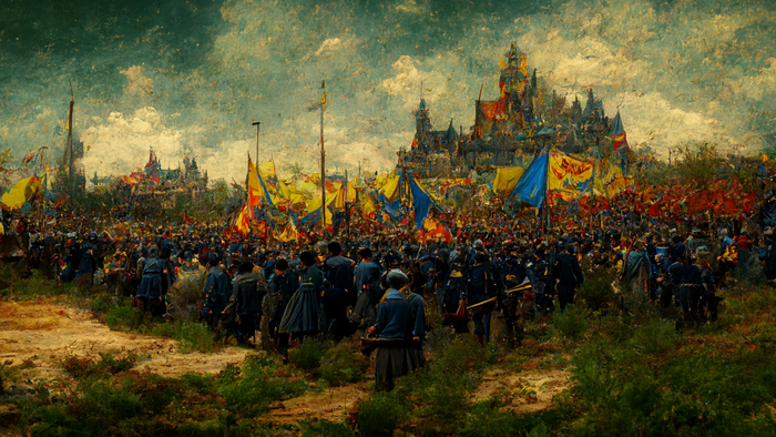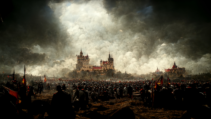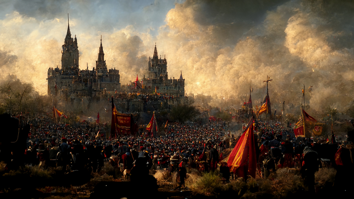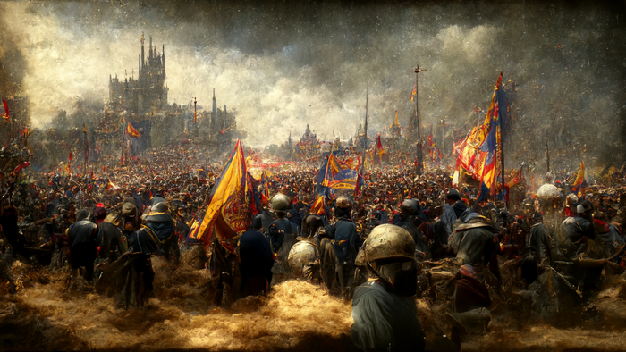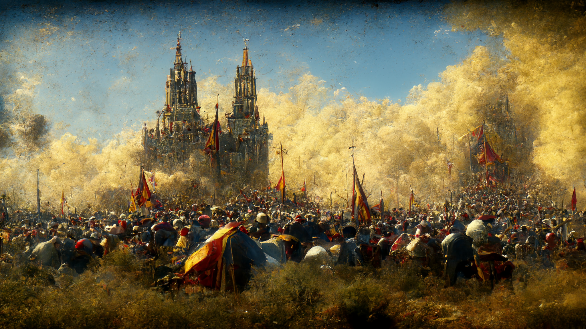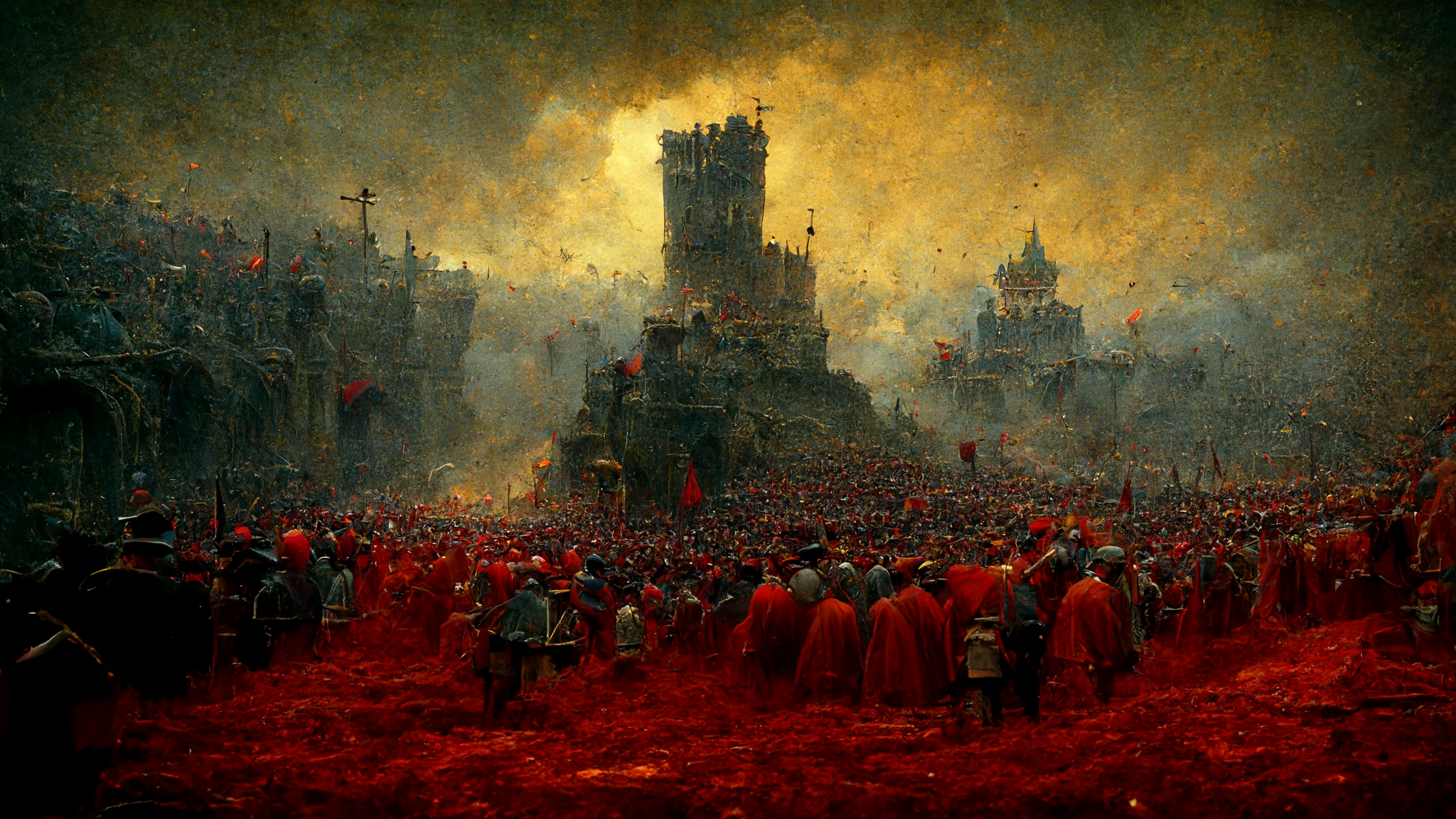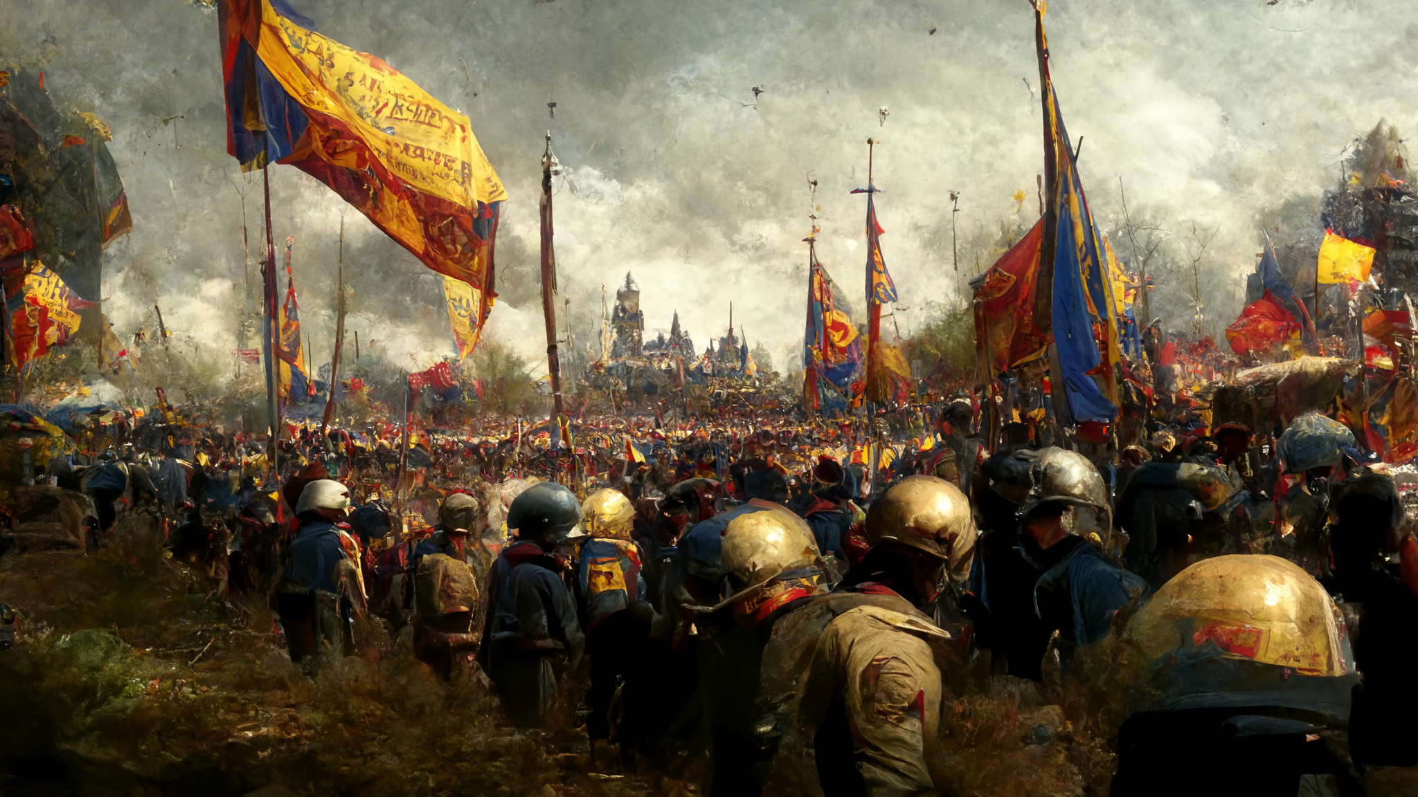 Экспериментировал с Midjourney, комбинируя имена различных художников с ключевыми словами "medieval 2 total war hyperrealism high detail --ar 16:9".