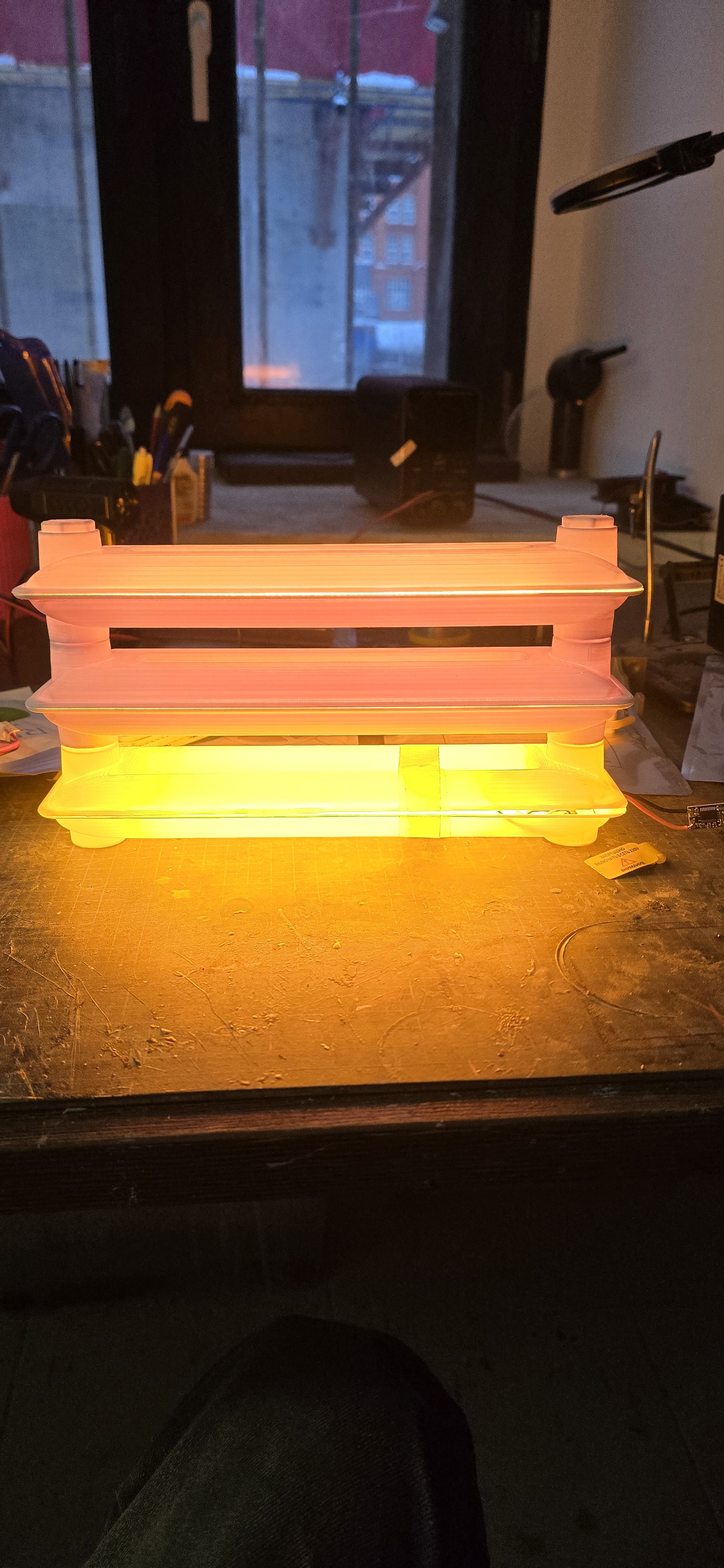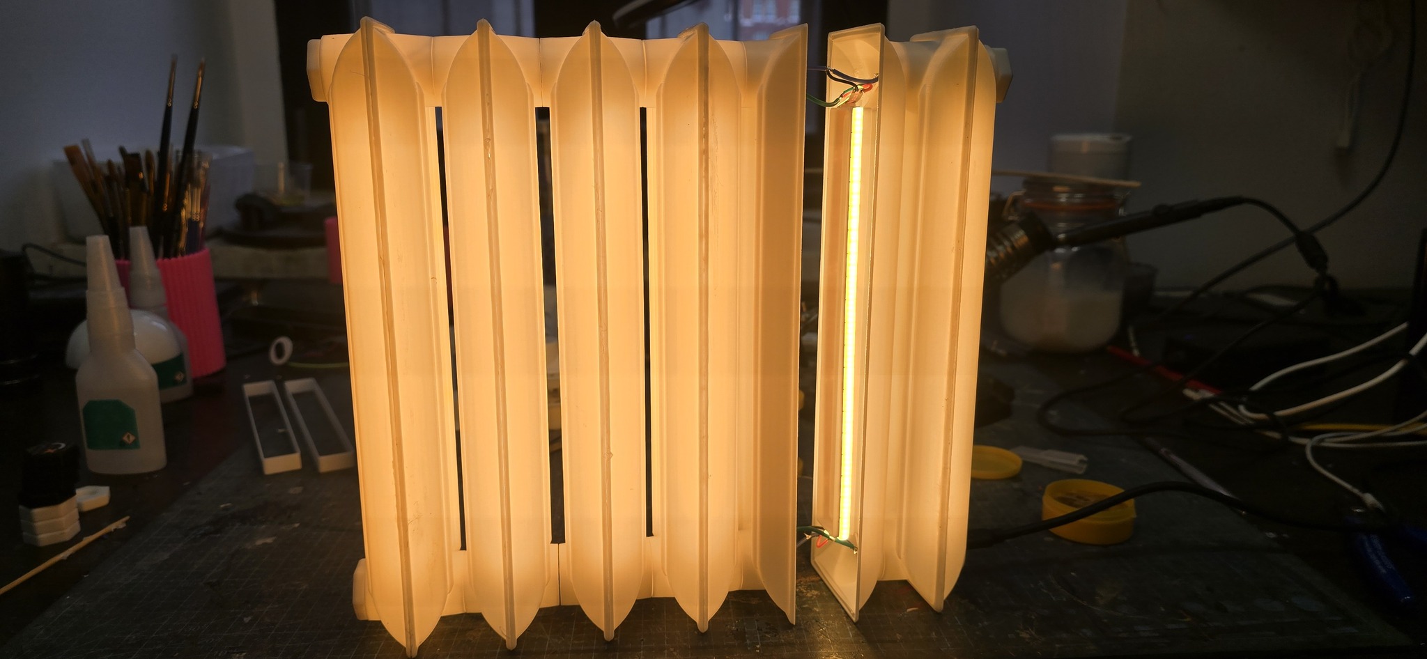 Долго не получался. Думал над креплениям, чтобы лампа была модульной. Думал над магнитами, передачей электричества, управлением. Перепробовал кучу вариантов подсветки. Оказывается часть лент греется и греется сильно. Думал над управлением питания. Потом долго ждал все детали. Сменил несколько вариантов модели, чтобы была похожа, достаточно крепкая и яркая.