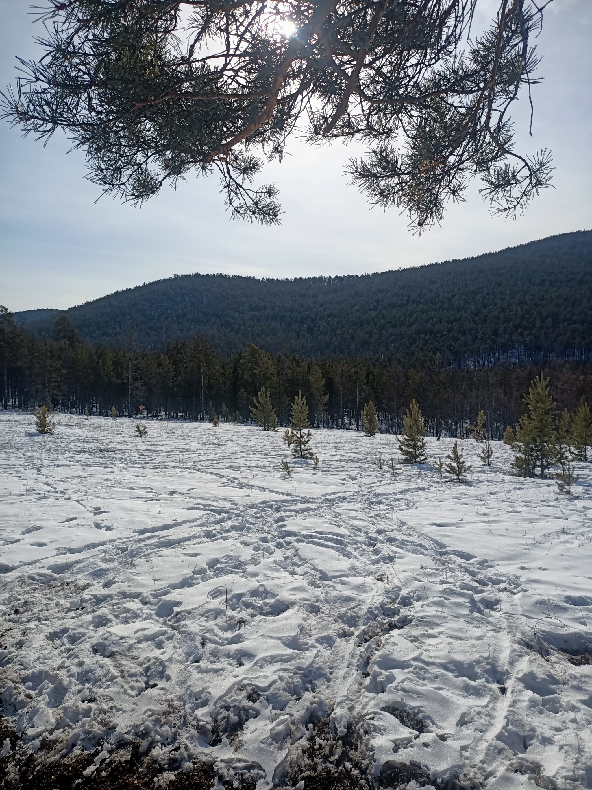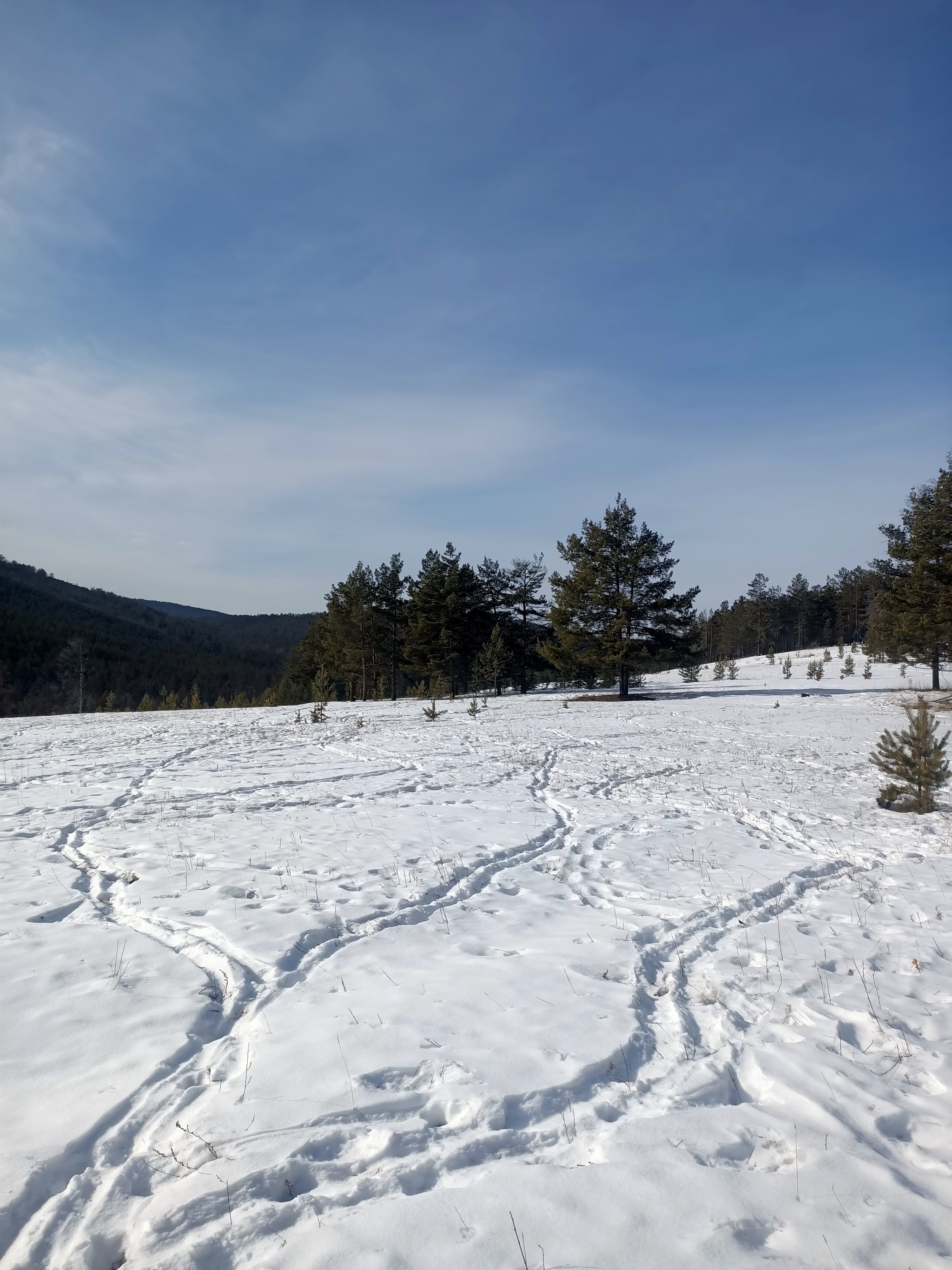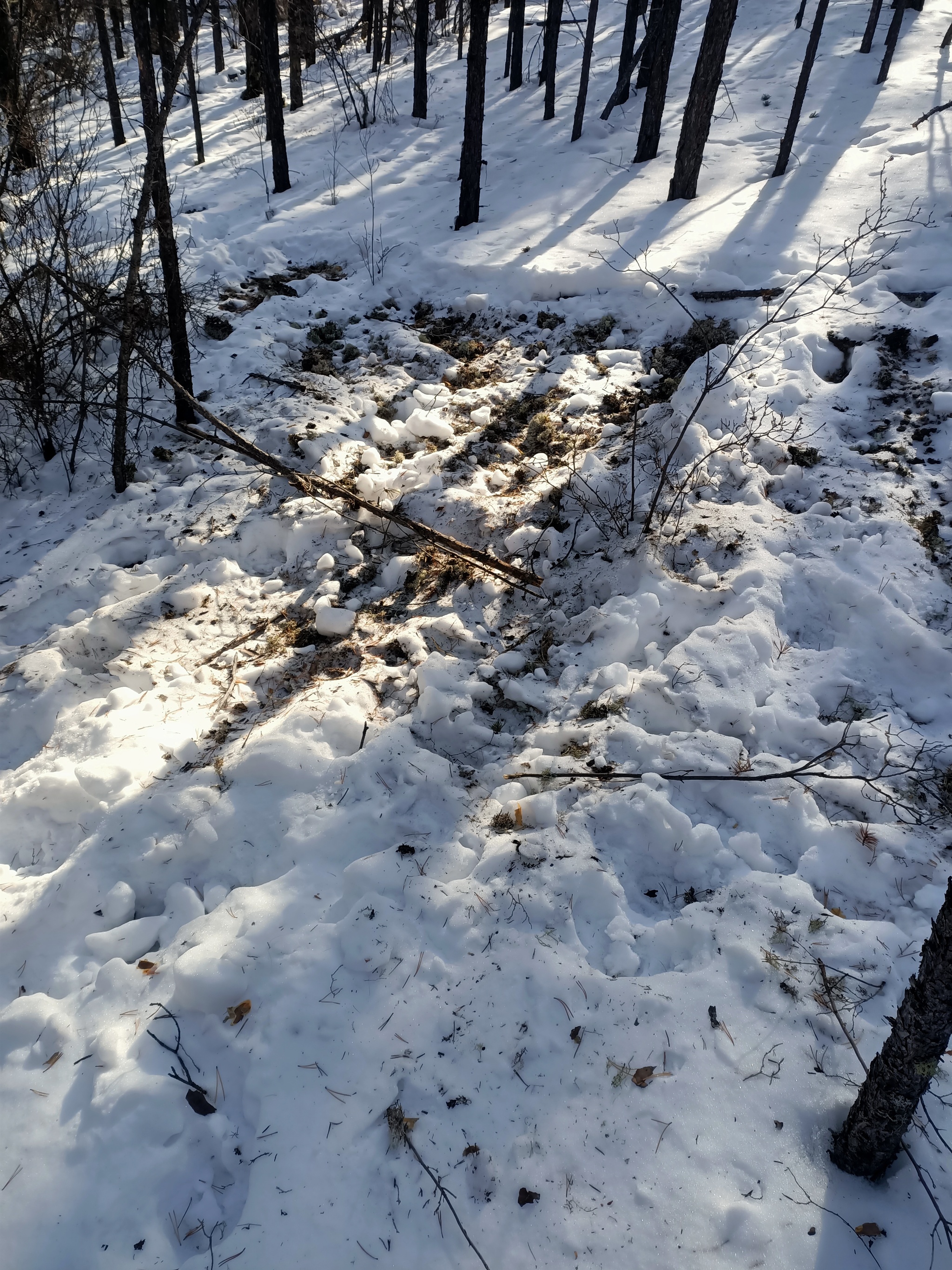 Лес красивый, в основном яркие рыжие сосны. Постоянно вижу следы прибывания оленей. В итоге, брожу несколько часов, пока не выхожу на окраину леса перед полем. Тут интуиция и предыдущий опыт подсказал выходить максимально аккуратно, что я и сделал. Смотрю влево, по середине, перевожу взгляд направо, вижу оленя в прыжке)) он меньше чем те возле жёлтого озера 24 февраля, и более серый, я подумал что поход на северного оленя. Бесшумно убежал вниз по склону, я его наблюдал меньше секунды.