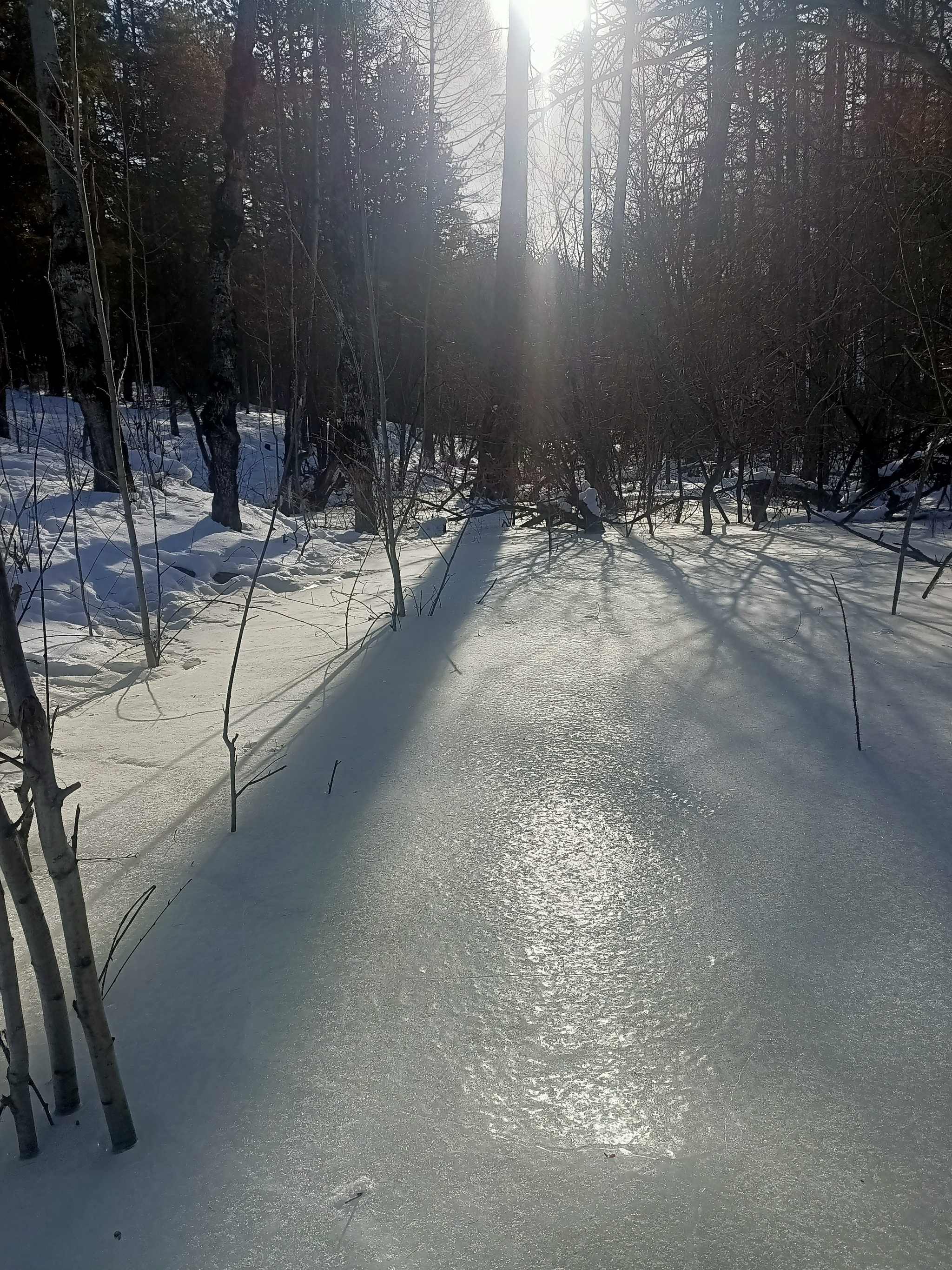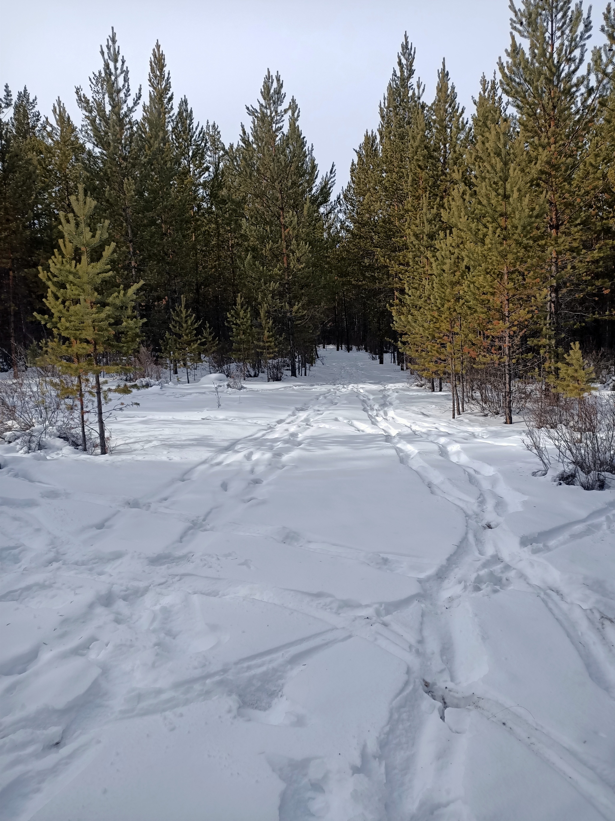 Застал, высматривая ещё что нибудь. Тишина. Продолжаю путь, остановился возле красивой сосны, перекусил Баунти. Спустился по следа оленя вниз, дошел до впадины (просто замёрзшее болото). Решил пойти по другой дороге, пора выходить к поселку. По пути следования сделал небольшую засаду, минут 15 в застывшем состоянии слушал и наблюдал за лесом и полянкой. Ничего ( продолжил путь до самого поселка без всяких трудностей, только ноги устали сильнее.
