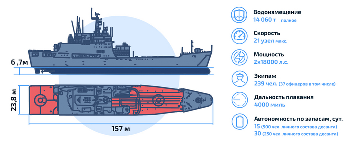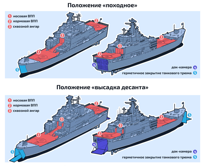 В отличие от своих зарубежных аналогов, «носороги» могли в случае необходимости подходить к занятому противником побережью, высаживая силы и средства морского десанта непосредственно на берег, что существенно ускоряло весь процесс. В частности, такой вариант мог быть применен при высадке морского десанта на участок побережья, очищенный от противника, в том случае, если поблизости не имелось возможности высадить десант на оборудованный причальный комплекс. Аналогичный вариант мог использоваться и в случае, если оборона противника на назначенном для высадки морского десанта участке побережья была слабой и могла быть подавлена в достаточно короткий отрезок времени и с минимальными усилиями — в этом случае не было необходимости применять «загоризонтную» высадку морского десанта. Ни один из зарубежных универсальных десантных кораблей или вертолетоносцев не может подходить близко к необорудованному побережью и не в состоянии высаживать силы десанта на упор. Впрочем, это — результат совершенно иного подхода наших бывших противников по «холодной войне» к проведению морских десантных операций и использованию соединений морской пехоты, который требует отдельного исследования.