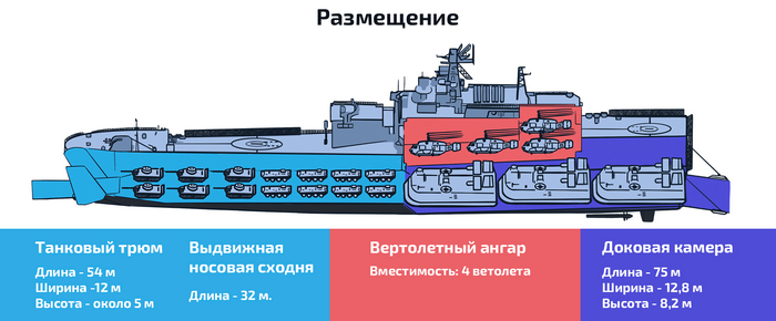 В танковый трюм, на верхнюю палубу и в доковую камеру (при отсутствии в ней плавсредств) корабль мог принять до 50 средних или основных танков, или до 80 боевых бронированных машин типа БТР или БМП, или до 120 единиц различных автомашин или другой подвижной техники в любых сочетаниях. Личный состав десанта размещался при этом в нескольких кубриках и четырехместных офицерских каютах.