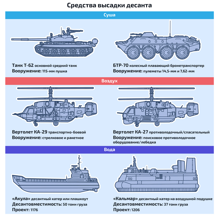 Транспортно-боевые вертолеты Ка - 29, способны принимать по 16 десантников каждый. Вертолет этого типа может оказывать огневую поддержку десанту благодаря наличию на борту стрелково-пушечного и неуправляемого ракетного вооружения.