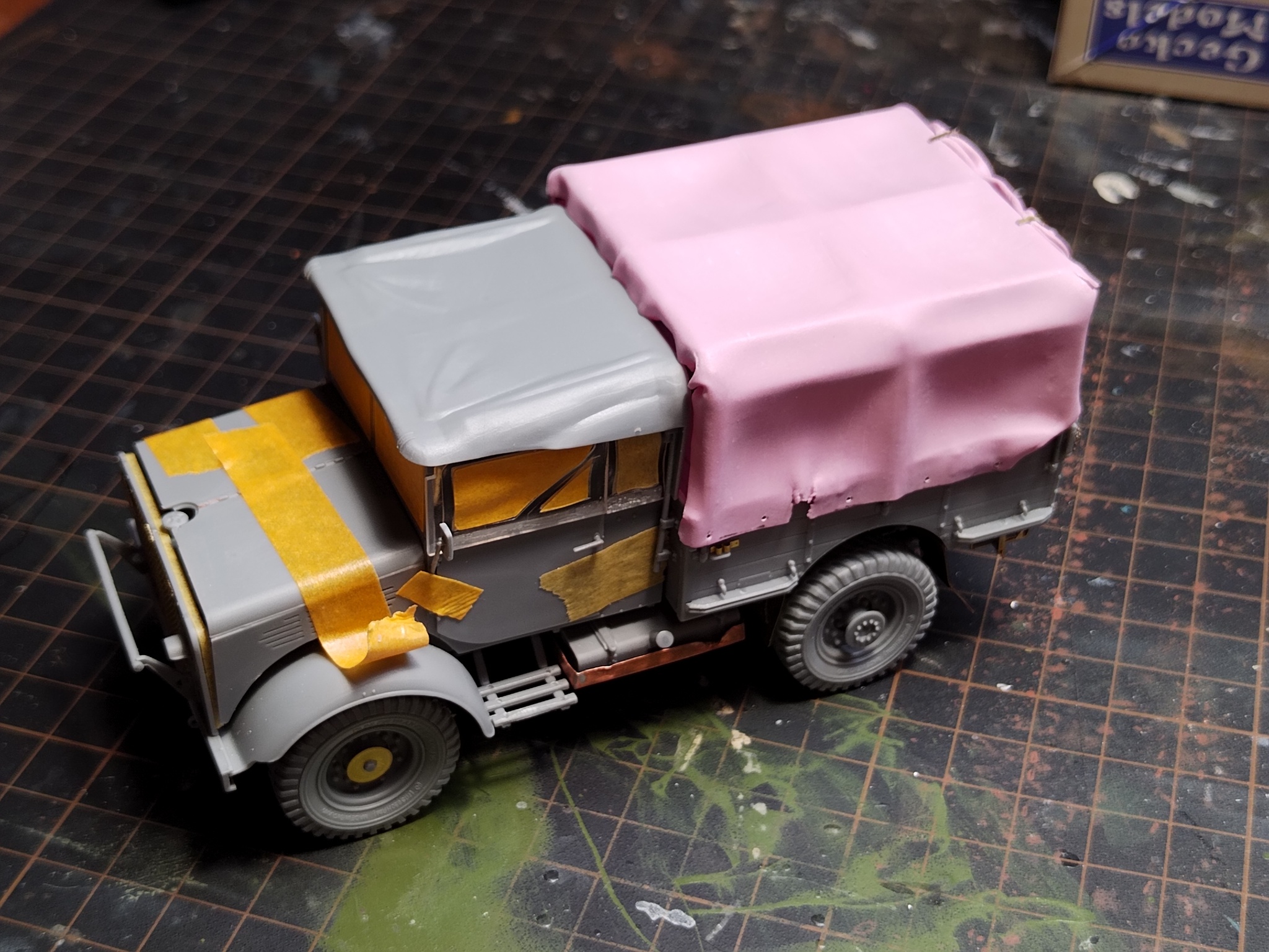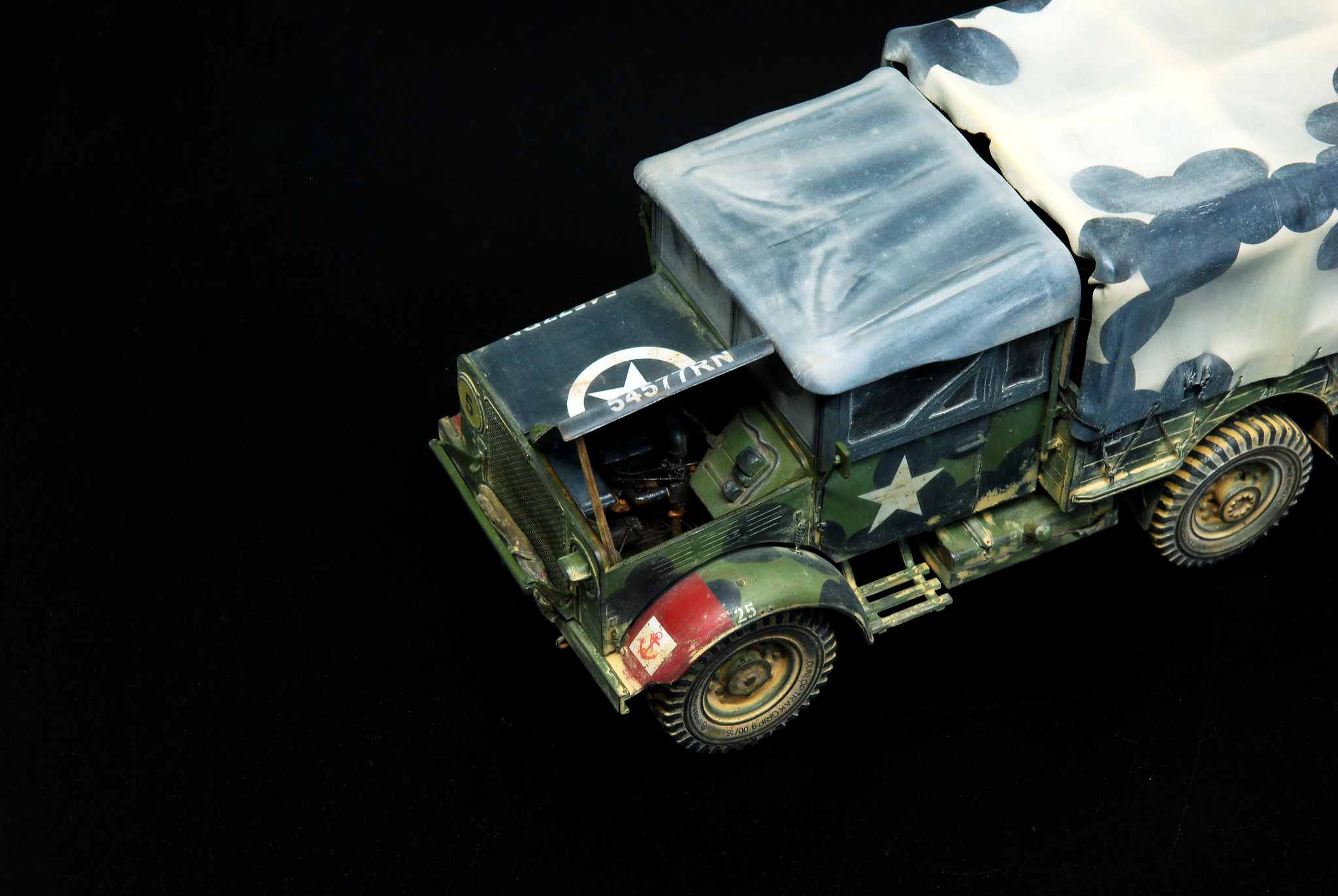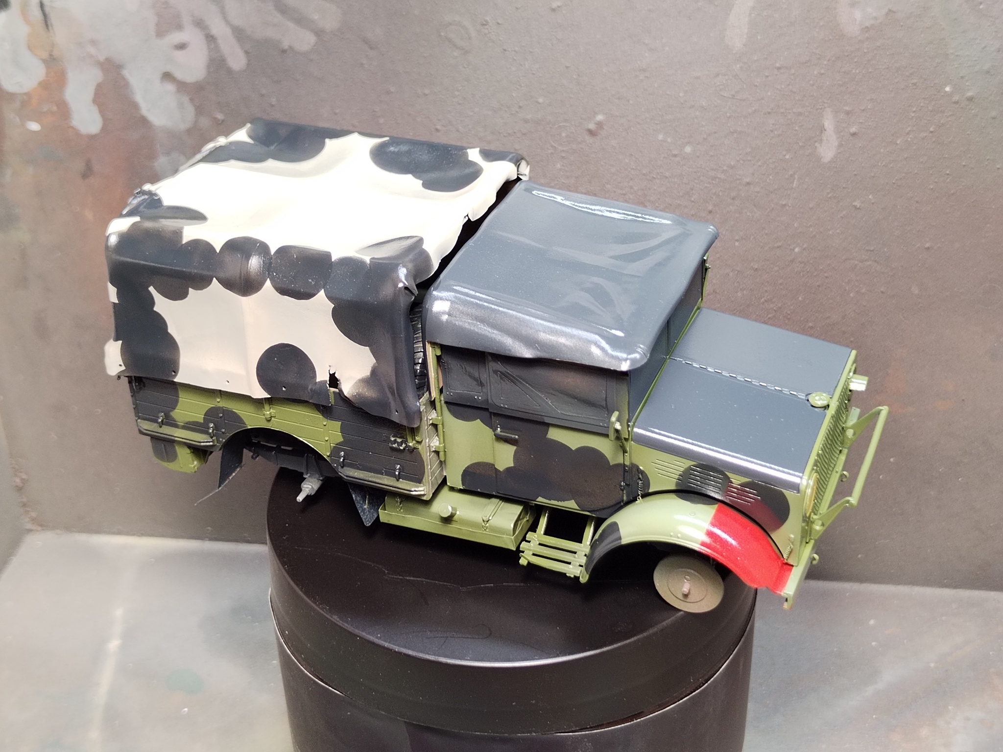 Ну и главная проблема набора видна на собранной на скотче кабине. Это плохая стыковка всей модели на финальной стадии. За один раз нужно состыковать нижнюю часть кабины, тент кабины, кузов, раму и сделать это так, чтобы передняя решетка радиатора не образовывала щель боковыми. Короче гемор с кучей прищепок, скотча и колдовства.