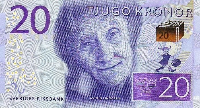 На банкноте 20 шведских крон образца 2015 года, посвященной Астрид Линдгрен, компанию писательнице составила именно Пеппи Длинныйчулок.