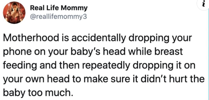 Материнство - это когда ты случайно уронила телефон ребёнку на голову, пока кормила грудью, и теперь ты несколько раз роняешь его себе на голову, чтобы убедиться, что ребёнку было не очень больно