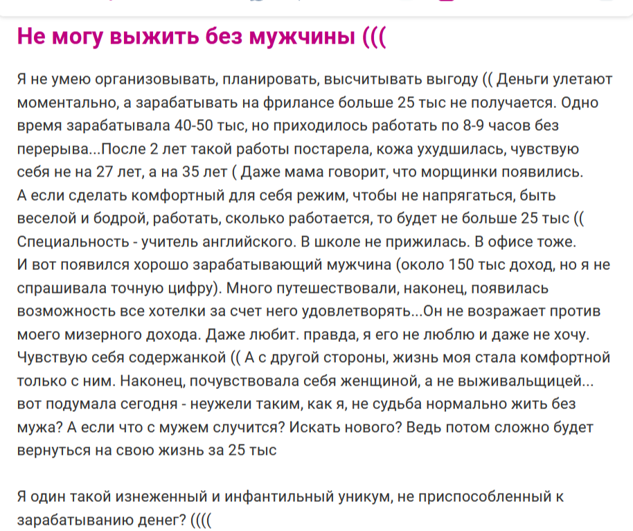 И вот появился хорошо зарабатывающий мужчина (около 150 тыс доход, ). Много путешествовали, наконец, появилась возможность все хотелки за счет него удовлетворять... Даже любит. правда, я его не люблю и даже не хочу