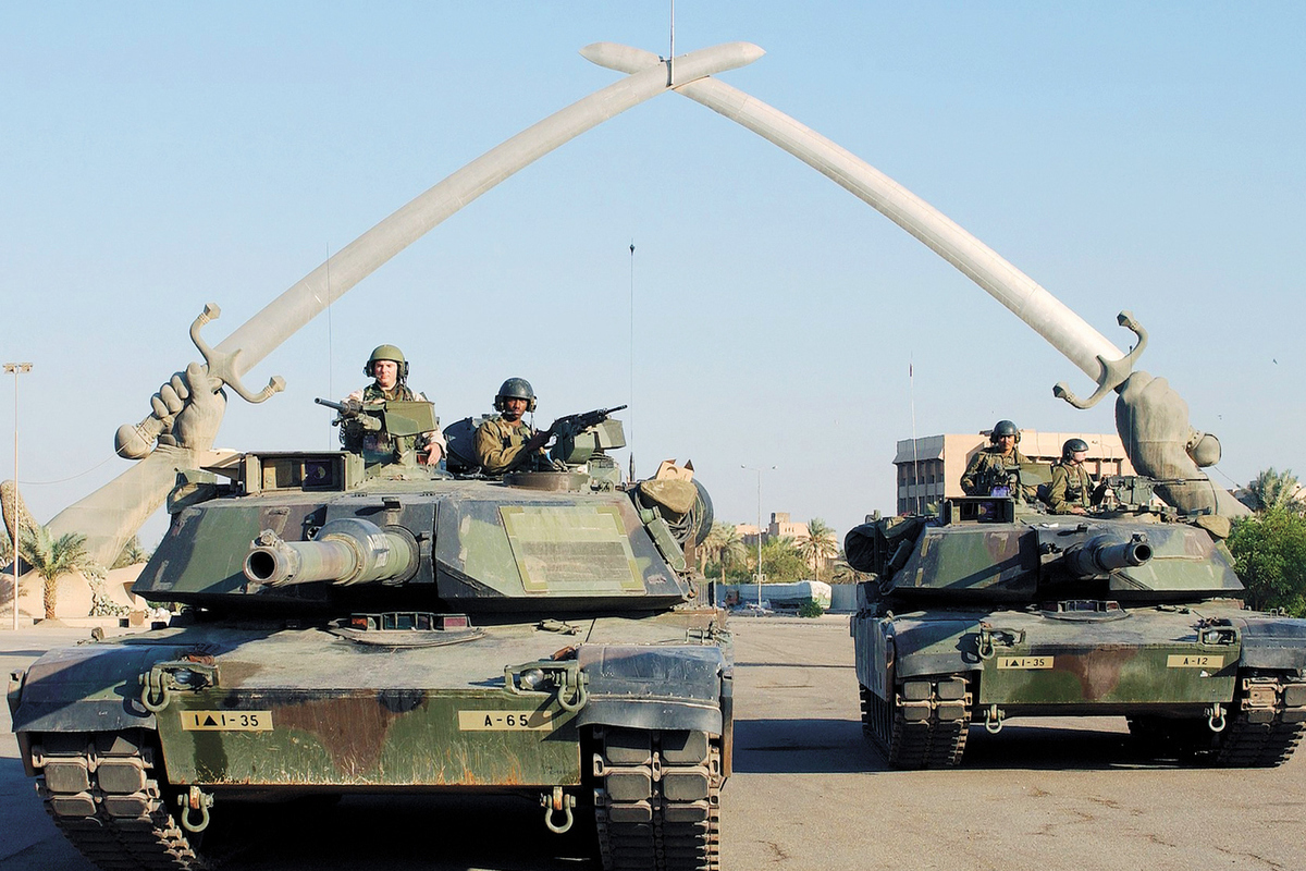 Американские танкисты у Мечей Кадисии - одного из главных памятников столицы Ирака, построенного при Хуссейне