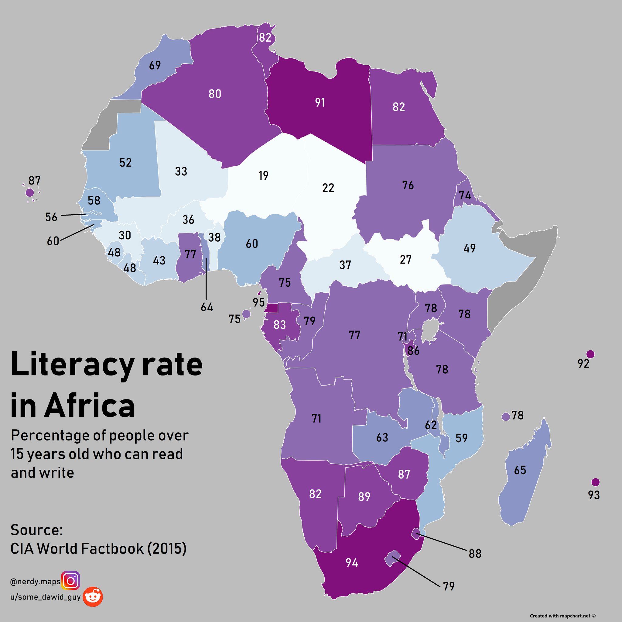 Показатели ВВП на душу населения и уровня грамотности (карта ниже) в Африке определённо говорят о том, что полностью сломать импульс развития Ливии, полученный при Каддафи, не удалось даже расколу государства и годам войны