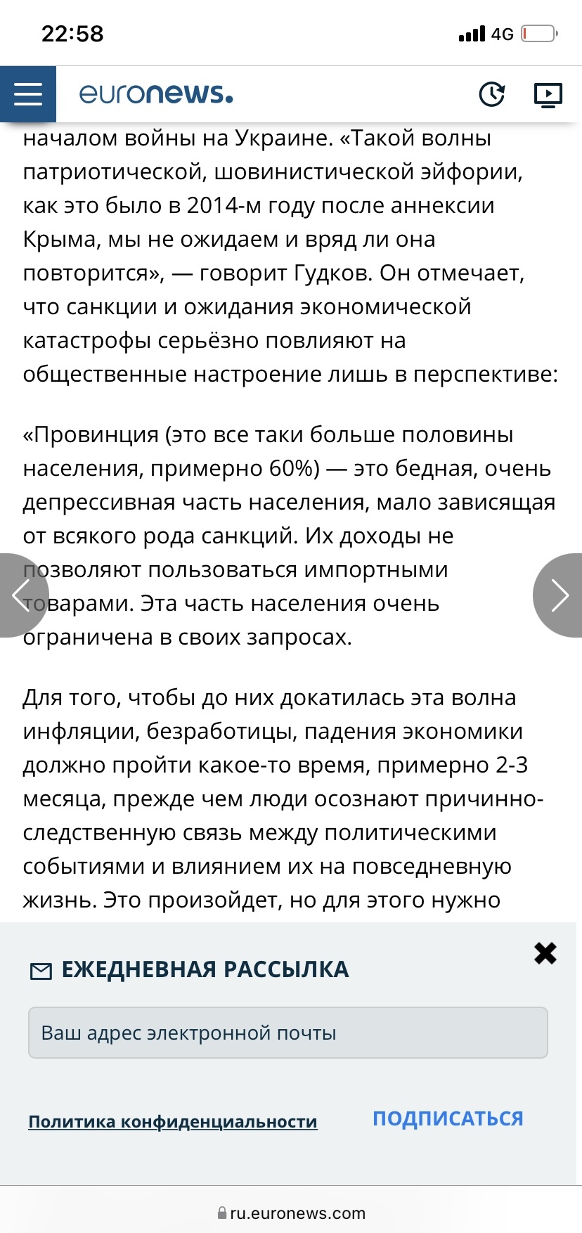 Я принадлежу к этим 60% бедных, депрессивных и, судя по мнению Гудкова, ещё и тупых жителей РФ, которые про импортные товары только слышали и зад газетой подтирают, и меня распирает от злости от факта такого преподнесения Европе представителем оппозиции Нашей страны своих сограждан - нас Россиян. Ну какой он русский после этого?! И как может представлять народ, которые совсем не знает?!