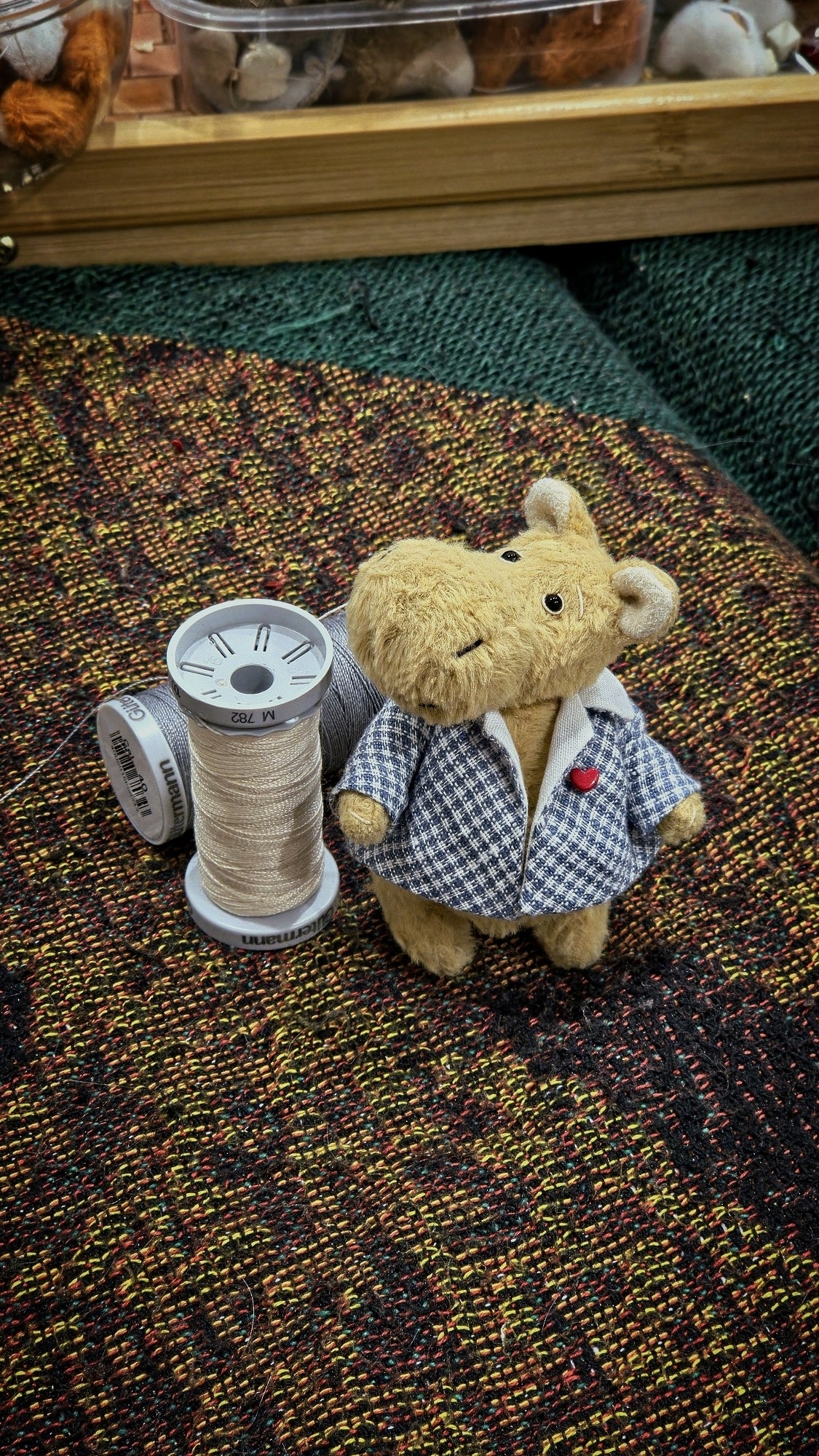 Рост 9 см, прекрасно помещается в ладонь, обратите внимание, что он чуть выше катушки ниток.