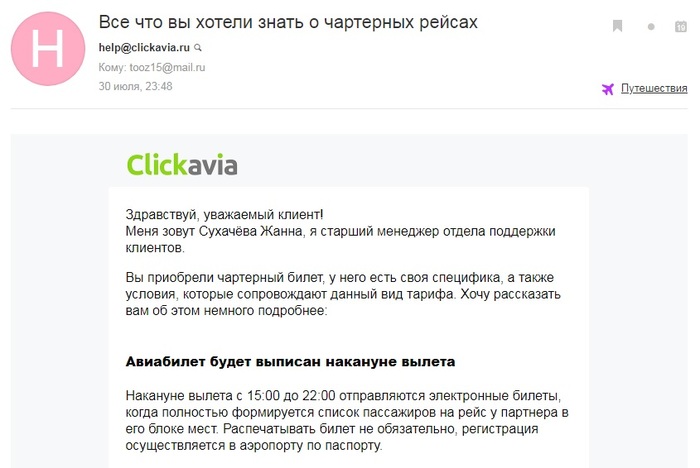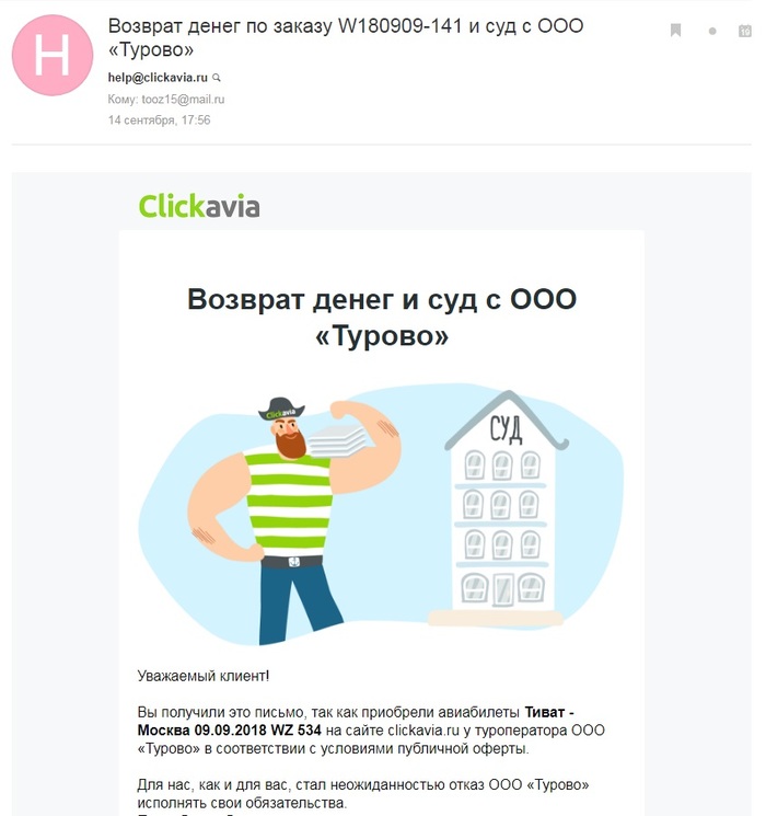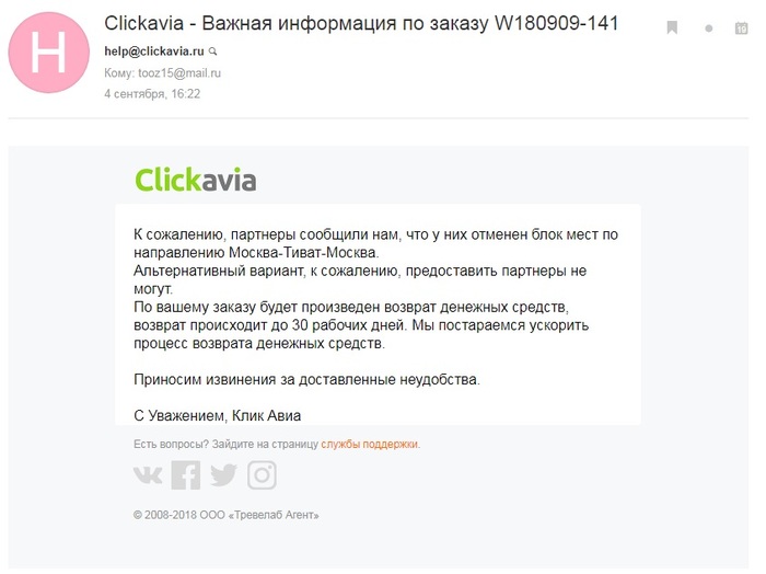 Началось все с покупки авиабилетов по маршруту Тиват-Москва на всем известном агрегаторе Aviasales (отдельный привет тем, кто у вас там на площадке проверяет партнеров). 30.07.2018 я приобрел 2 билета на рейс WZ 534 авиакомпании RedWings. После оплаты билетов (в размере 26745,00 руб) мне приходит чудесное письмо от Clickavia. Можете почитать его сами