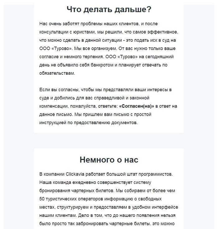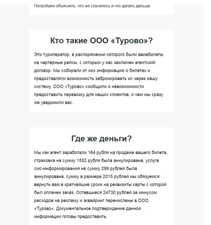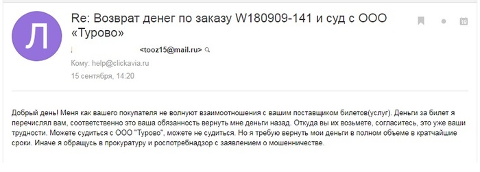О-ля-ля. Где деньги, Лебовски? А деньги у некой мифической компании ООО "Турово", говорят мне Clickavia. Если хотите назад свои деньги, милости просим - подавайте в суд на них. И до окончания суда с ООО "Турово" мы ваши кровные не вернем, закатайте губу, уважаемый. Мы сами то заработали всего 156 рублей на этой сделке, бедные-несчастные.