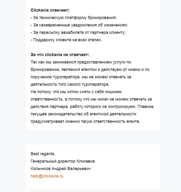 Т.е Clickavia оставляют меня с женой в чужой стране без заранее купленных билетов. И возвращайся как хочешь, можешь даже пешком. Опустим тот факт, что у меня с собой могло не оказаться достаточно денег на покупку других билетов (или возможное отсутствие билетов на нужную мне дату как таковых),а деньги будут возвращать аж 30 рабочих дней. Это только цветочки. Ягодки начались, когда эти "товарищи" прислали мне следующее письмо спустя еще несколько дней.