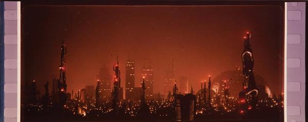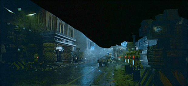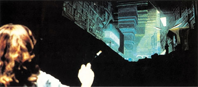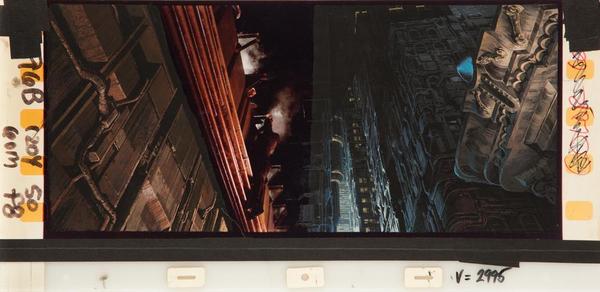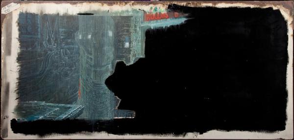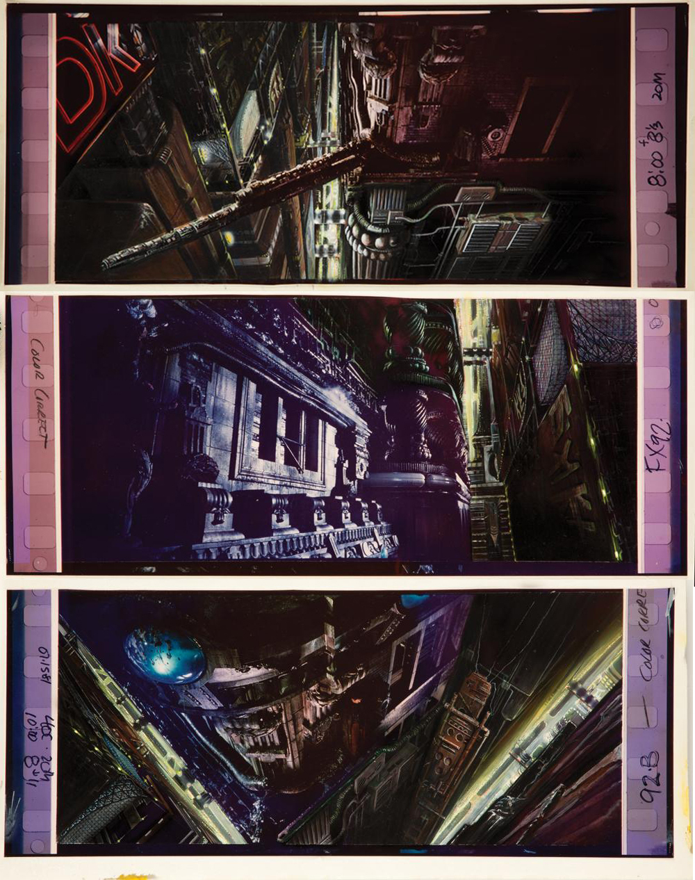 В этом кадре реальна только сама Прис (и два нижних этажа здания). Все, что изображено вокруг нее – это картина Мэттью Юрисича, написанная по дизайну Сида Мида. Все, что двигается вокруг нее на улице, это либо модели (летящий мимо спиннер, например), либо наложенные позже поверх мэтт-пейтинга световые эффекты и клубы дыма с дождем.
