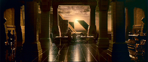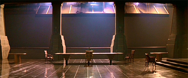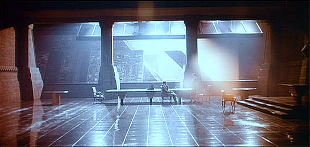 Еще один пример подобной сцены – эпизод в офисе Тайрелла. Это – особенно красивая часть фильма - с огромным окном, за которым мы видим вторую пирамиду и восходящее солнце. Вот так выглядит декорация кабинета Тайрелла без эффектов: