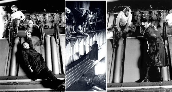 В сцене, где Декард висит над пропастью, под его ногами мы видим одну из этих девяти картин. Эти кадры пришлось переснимать, подложив вниз белый пенопласт. Иначе не представлялось возможным сделать маску, выделившую бы фигуру актера на фоне земли.