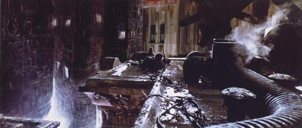 В сцене финальной битвы Декарда с Батти использовано девять картин, две из которых написаны Рокко Джиоффре. Первые дизайны городского пейзажа, который Декард должен был увидеть с крыши, режиссер Ридли Скотт отверг: они были слишком яркими и показывали открытое пространство, а Ридли хотел передать ощущение замкнутости и спертости. Чтобы зритель почувствовал безысходность, будто герой попал в западню.