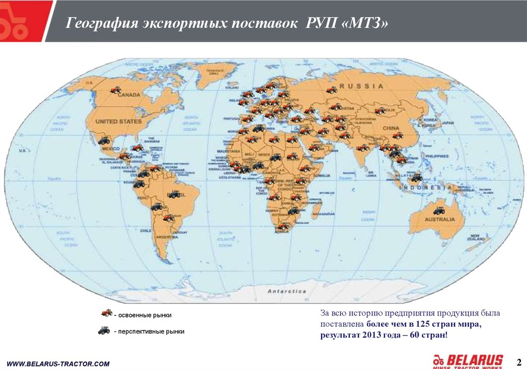 Высокие технико-экономические показатели тракторов «Беларус» в сочетании с их надежностью и безопасностью сделали их востребованными не только в нашей стране, но и за рубежом: более чем в 80 странах, включая Великобританию, Францию, США, Канаду, Германию, Италию, Швецию и др.