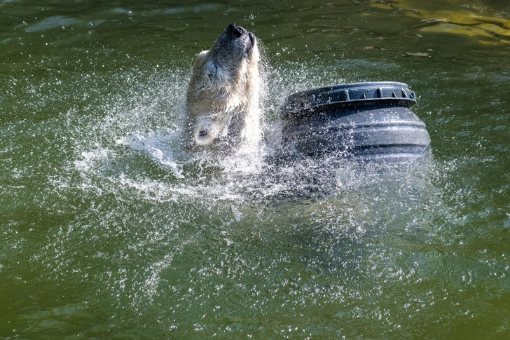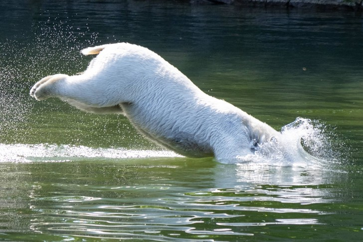 Белая медведица из Берлинского зоопарка с наслаждением прыгает в воду, чтобы спастись от жары.