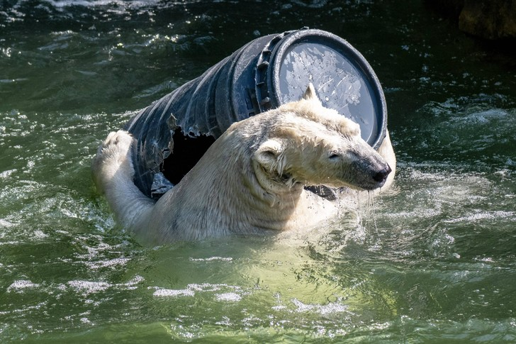 Белая медведица спасается от жары в немецком зоопарке
