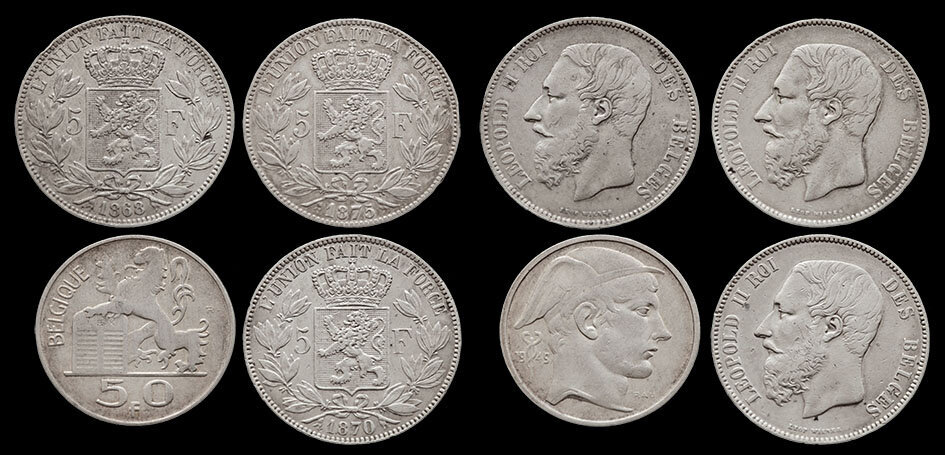 Три монеты 5 франков, Бельгия. Валютный (монетный союз). Не первые монеты этой весьма интересной группировки. Да и бельгийский 5-франковик у меня уже был (1876 года). Но тем не менее, а скорее более они интересны. В первую очередь исполнением. Предельно четко и ясно. LEOPOLD II ROI DES BELGES - Леопольд №2, король бельгийский. На реверсе коронованный герб государства в венке из лаврушки. L'UNION FAIT LA FORCE - Единство создает силу.