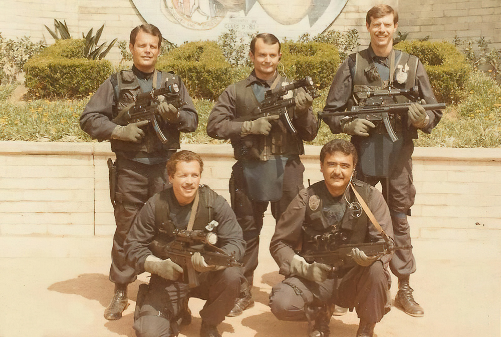 Офицеры спецназа полиции Лос-Анджелеса позируют с пистолетами-пулеметами H&K MP5 и автоматами PTR 91 (копия Heckler & Koch G3) перед летними Олимпийскими играми 1984 года.