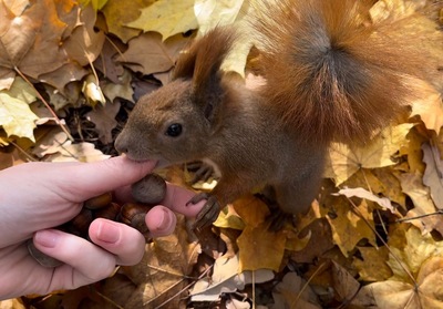 хм. кладу орех просто на ладонь и так плашмя даю белке. почему-то думаю, что если давать орех на кончиках пальцев, она может перепутать палец с орехом.