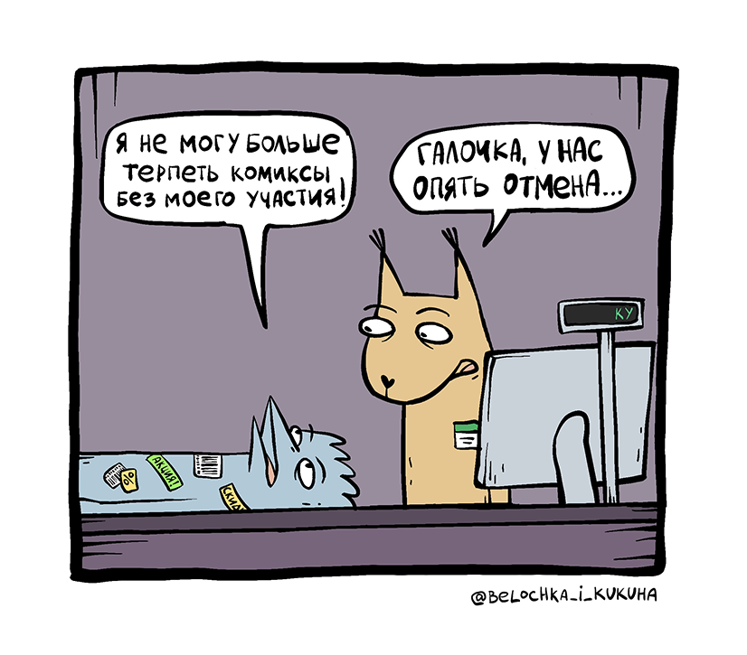 "Культура отмены" - арка комикса "Белочка и Кукуха" про приключения наших героев в супермаркете. Проходят дни, мелькают лица, крутится лента покупок. Но рано или поздно обязательно случится она - ОТМЕНА.