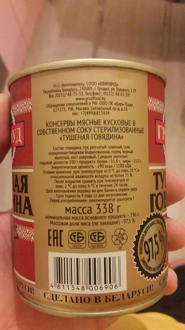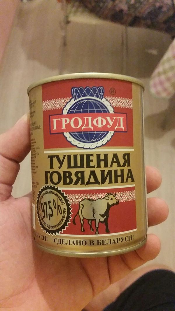Однажды на даче у товарища попробовал тушенку производства Беларуси и тут я понял, что, черт побери, храни господь батьку. Она была идеальная. Т.е. дохрена мяса, без жил, хрящей и прочей дряни. По работе коллега поехал в Беларусь и я попросил привезти мне все виды тушенки, которые ему попадутся в магазине. По факту получилось что-то около 20 видов, если память не изменяет, по деньгам на пару тысяч, было это примерно года 3 назад. Не все банки меня порадовали, и там оказались достаточно паршивые экземпляры, но в очень небольшом количестве. Явным лидером была тушенка, производства г. Гродно, на которой было написано, что содержание мяса в закладке 97.5%. Проблема была в том, что в Москве такую найти было просто нереально и тут на днях я встретил ее. Цена 249 руб за банку, но оно стоит того. Специально для тех кто разочаровался найти нормальную тушенку, обязательно купите. Мяса под завязку, на дне тоненький слой сала и маленький лист лаврушки.