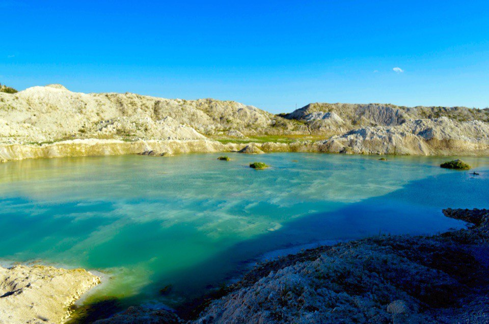 Карьеры тогда не были официально закрыты, но шлагбаум какой-то стоял, больше никаких запрещающих знаков. Обвалов не было, но ландшафт такой, что из него хрен вылезешь - растительности нет, уцепиться не за что, склоны крутые - на фото чувак собирается нырять примерно с трех метров. Прежде, чем лезть купаться, рубили лопаткой ступеньки в породе и то, мокрой рукой тяжело за нее было взяться - соскальзывала. Глубину определить не удалось, но больше метров четырех, хотя воды приточной там скорее всего нет, только осадочная. Там были большие выработки, но на этом карьере она закончилась относительно недавно - перед ними было 2-3 старых, так они уже все поросли водорослями и там мужики рыбачили, в этих какой-то живности замечено не было. Очень красиво, комаров нет, но были какие-то кусачие мухи в июне. Если плавать не умеешь, то пиздец. Ну а пофоткаться можно. Кстати, из-за практически полного отсутствия людей мы там откровенно нудили - вот, пару фоток осталось.