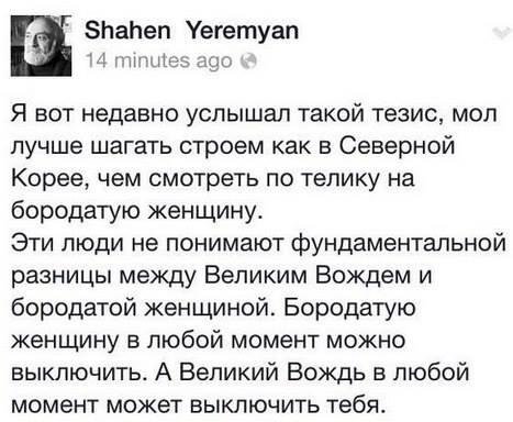 Когда в 90х победила Дана Интернешнл - всем было пофиг, преспокойненько напевали "вива ля дива" и в ус не дули. Верка Сердючка - практически всенародно любимая певица, ее приглашают на новогодние огоньки и прочие аншлаги. А тут просто мужик не побрился, да еще и ориентацию свою не скрывает! Ужос, ужос! Сжечь! Как по мне - отличный эпатаж. Ничем не отвратнее Киркорова. Даже симпатишненько :) минусите давайте, минусёры ;)