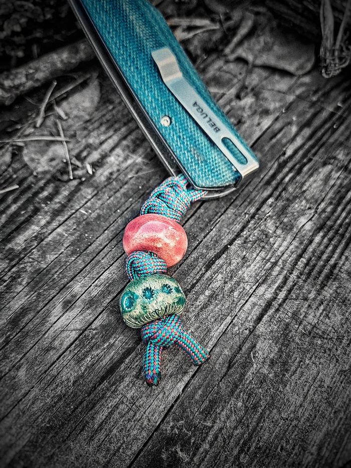 В руке удобен, режет так, что ой, так что я ни на грамм не разочарован, с учетом красивенькой микарты, К110 и цены в 4К, топ за свои деньги, как по мне. Бусины на ноже- керамика, подарок хороших людей на том же Клинке.