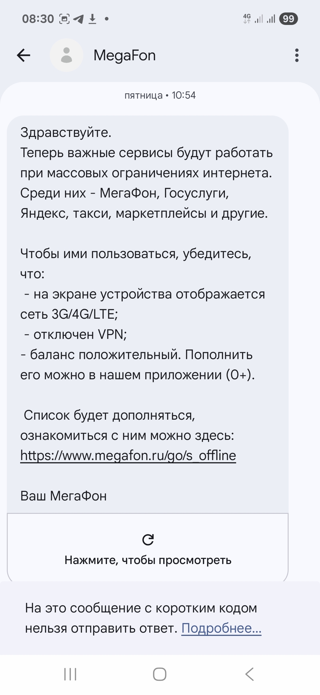 Так вот, давеча присылает мне ОпСоС СМС, дескать мы всё починили сделали, как роскомнадзор приказал, вы теперь можете ходить в сеть по талонам "белому списку" сайтов.