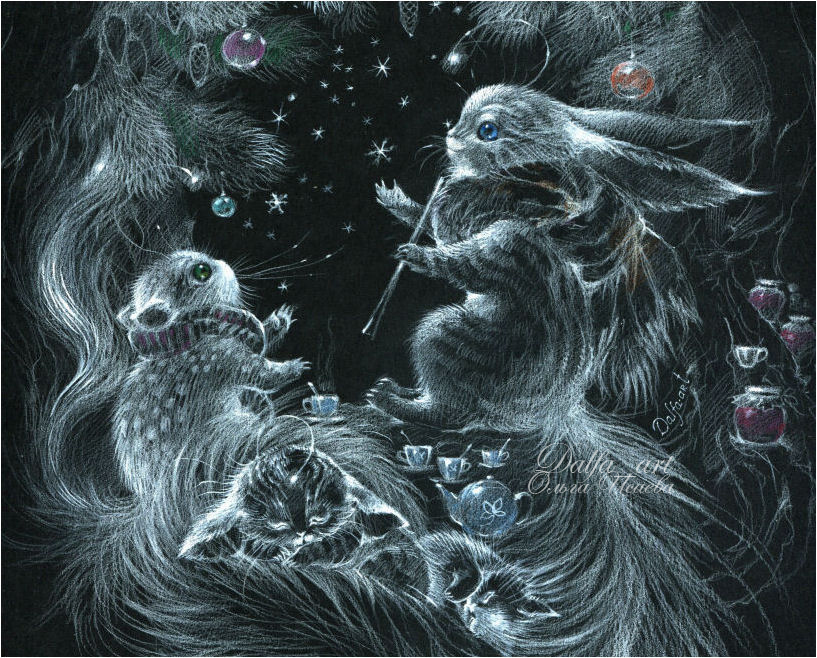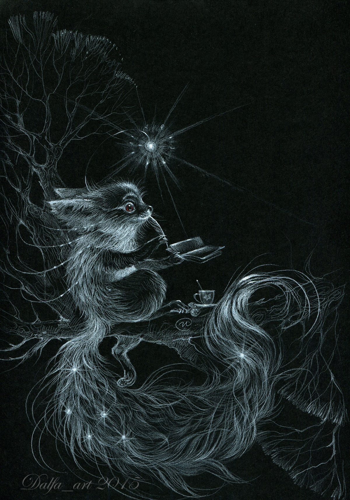 Долго хотелось попробовать белый карандаш по черной бумаге. Идея свечения, всех этих звездных зёрнышек и фонариков пришла почти сразу, а вот материалы пришлось подбирать долго - в итоге всё сошлось всего на двух видах бумаги и на одном карандаше. А дальше - понеслось! Родились Сказки Карамельного леса... но и крипотушка тоже проскочила, черная бумага располагает вполне.