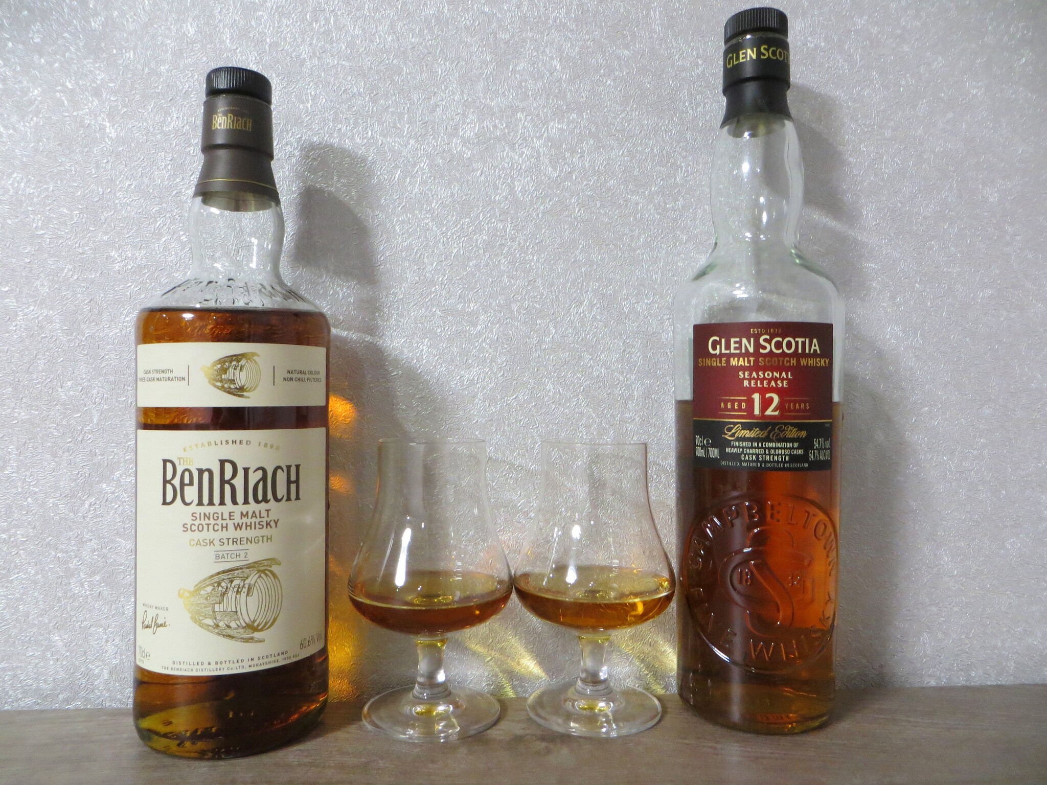 Подыскал этому релизу более-менее близкого по крепости оппонента, авторства мастер-дистиллера Иэна Макалистера - Glen Scotia 12 YO Seasonal Release 2021 - немного постарше, тоже с тремя бочками (похожими), правда, с 12-месячным финишированием (но раздельным) после основной экс-бурбонной выдержки - в американских глубоко обугленных и экс-олоросо бочках.