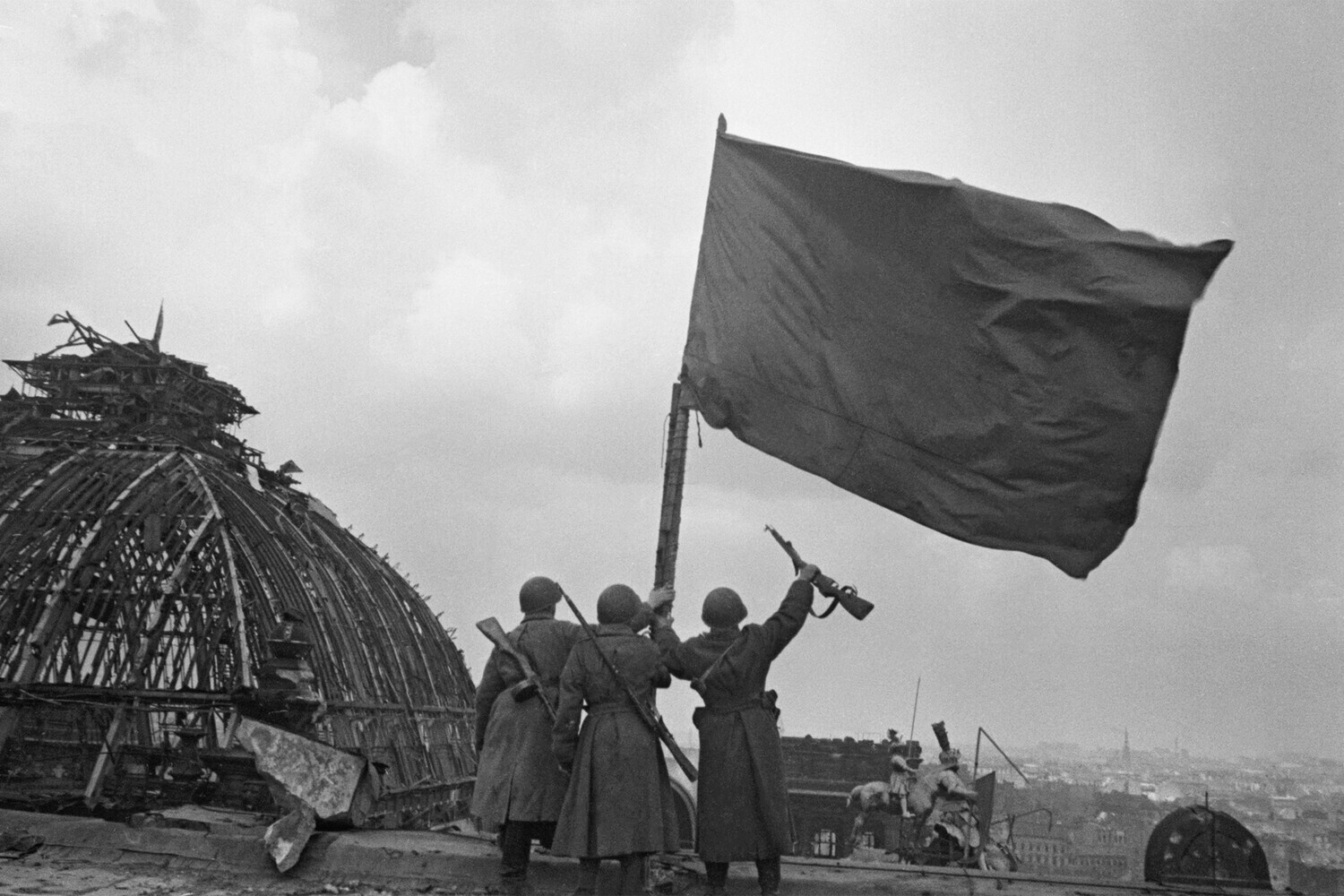Лейтенант Кузьма Дудеев и старший сержант Иван Андреев водружают Красное знамя на квадриге Бранденбургских ворот в Берлине. Евгений Халдей