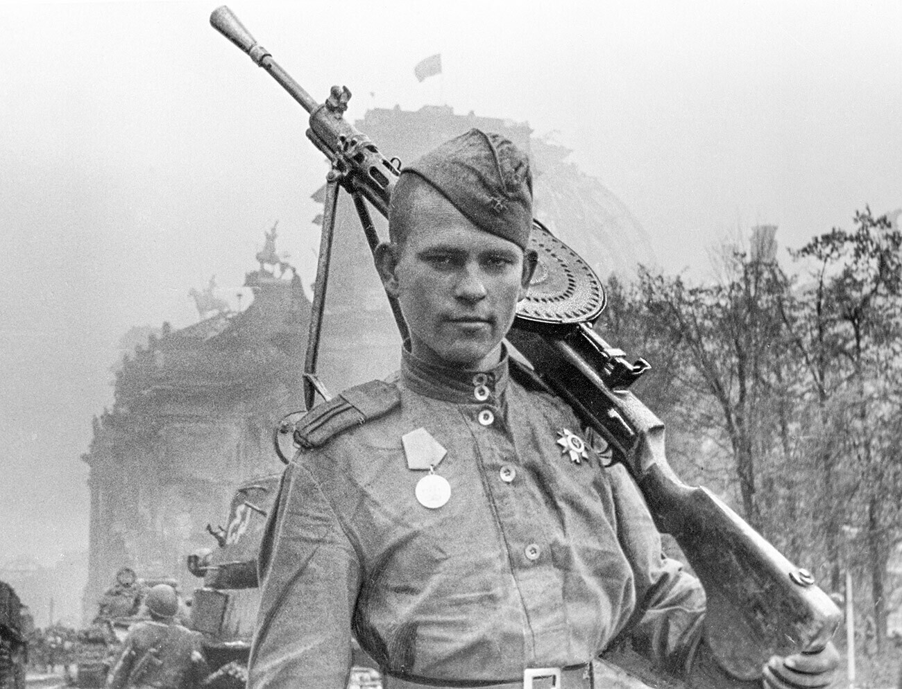 Дошел! Красноармеец-пехотинец Михаил Макаров, который дошел до Берлина. Перед рейхстагом. Анатолий Морозов