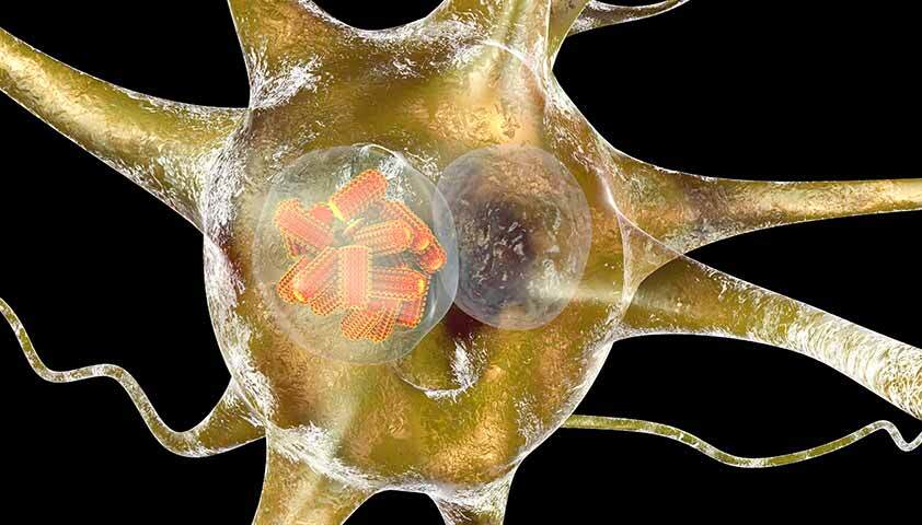 Достигнув мозга, вирус бешенства начинает активно размножаться и распространяться по нейронам. Это приводит к развитию энцефалита — воспаления головного мозга.